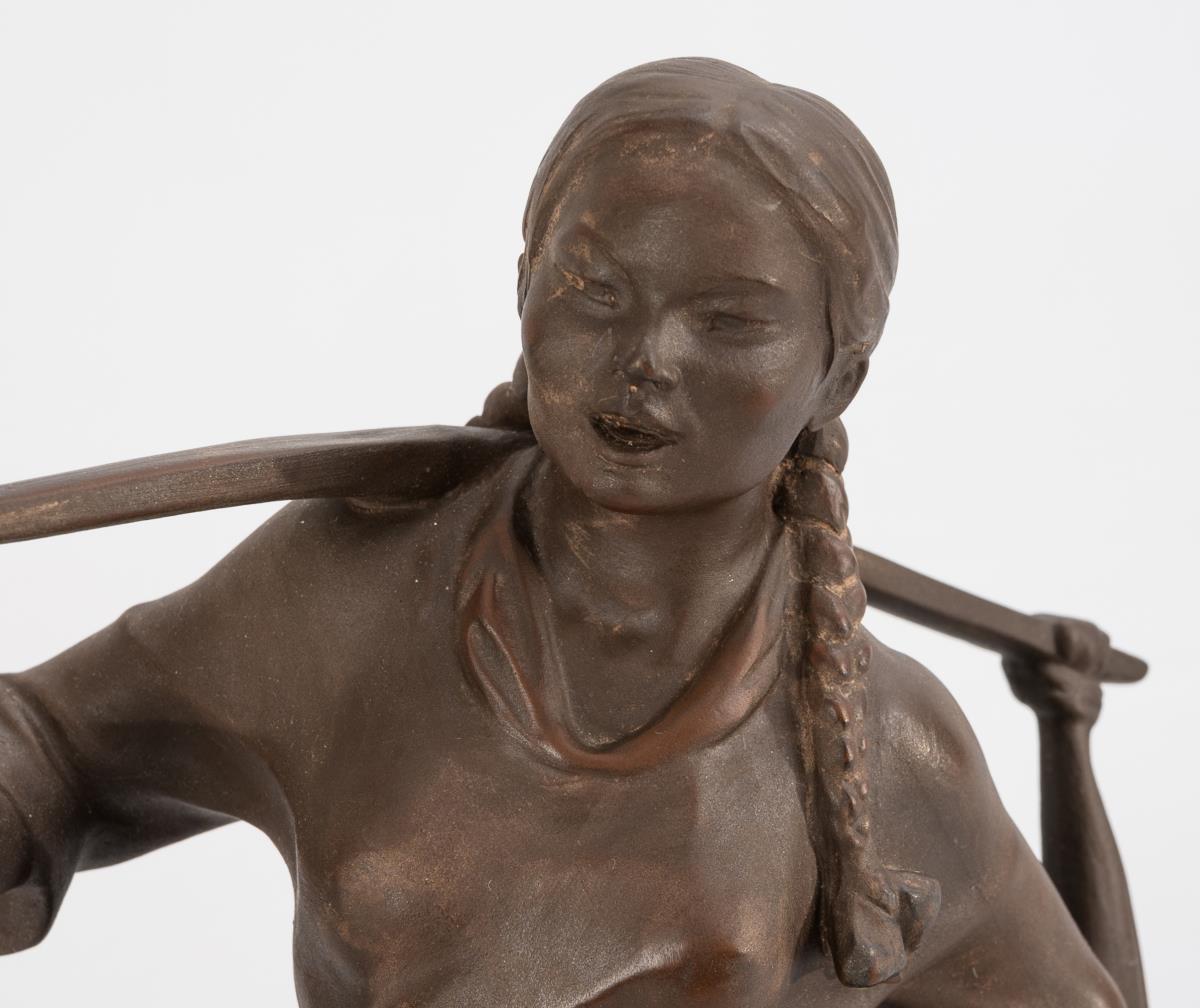 A Asian woman carrying two fruit baskets with a yoke.