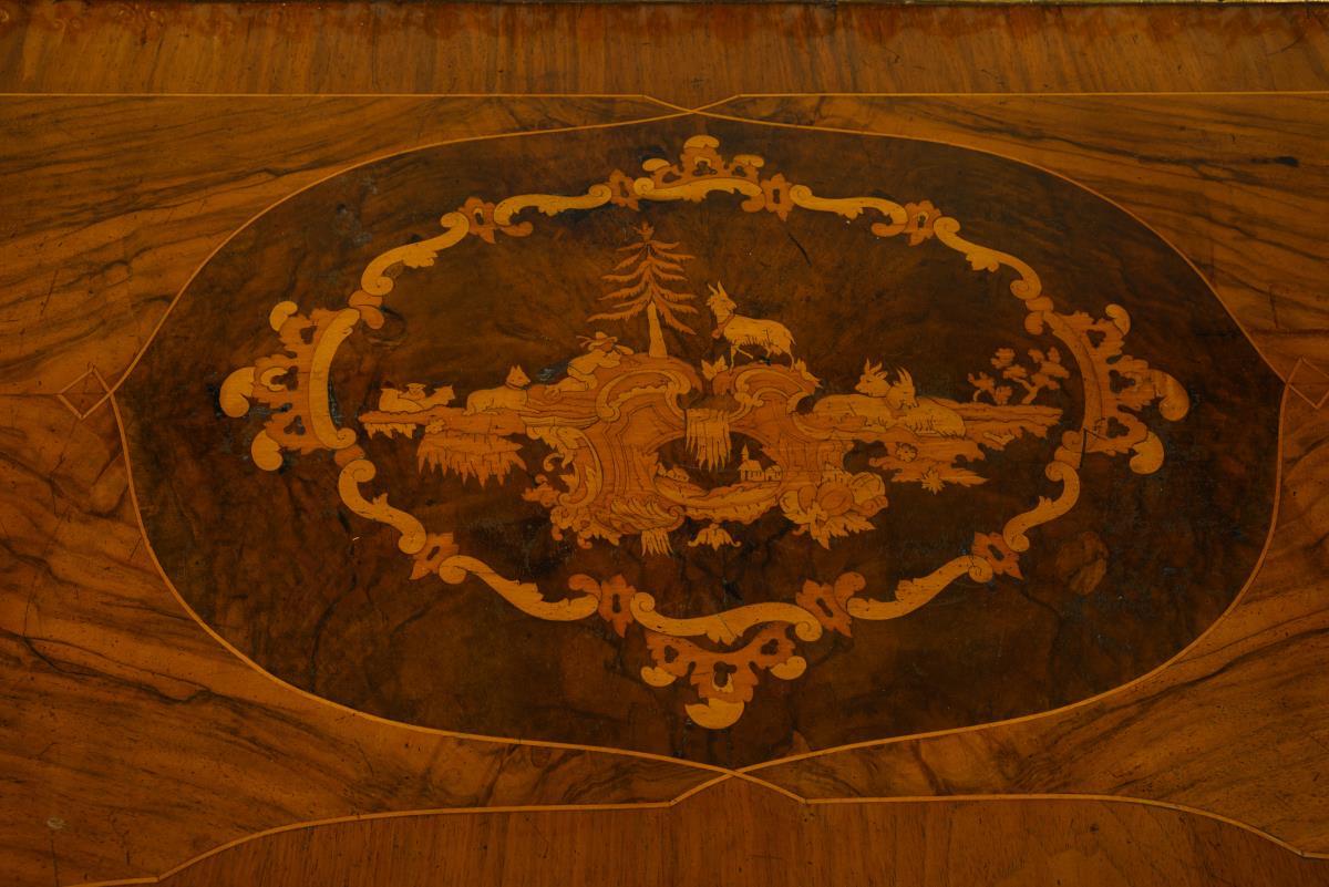 Walnut veneered and other woods marquetry. Approx. 80 x 92 x 60 cm.