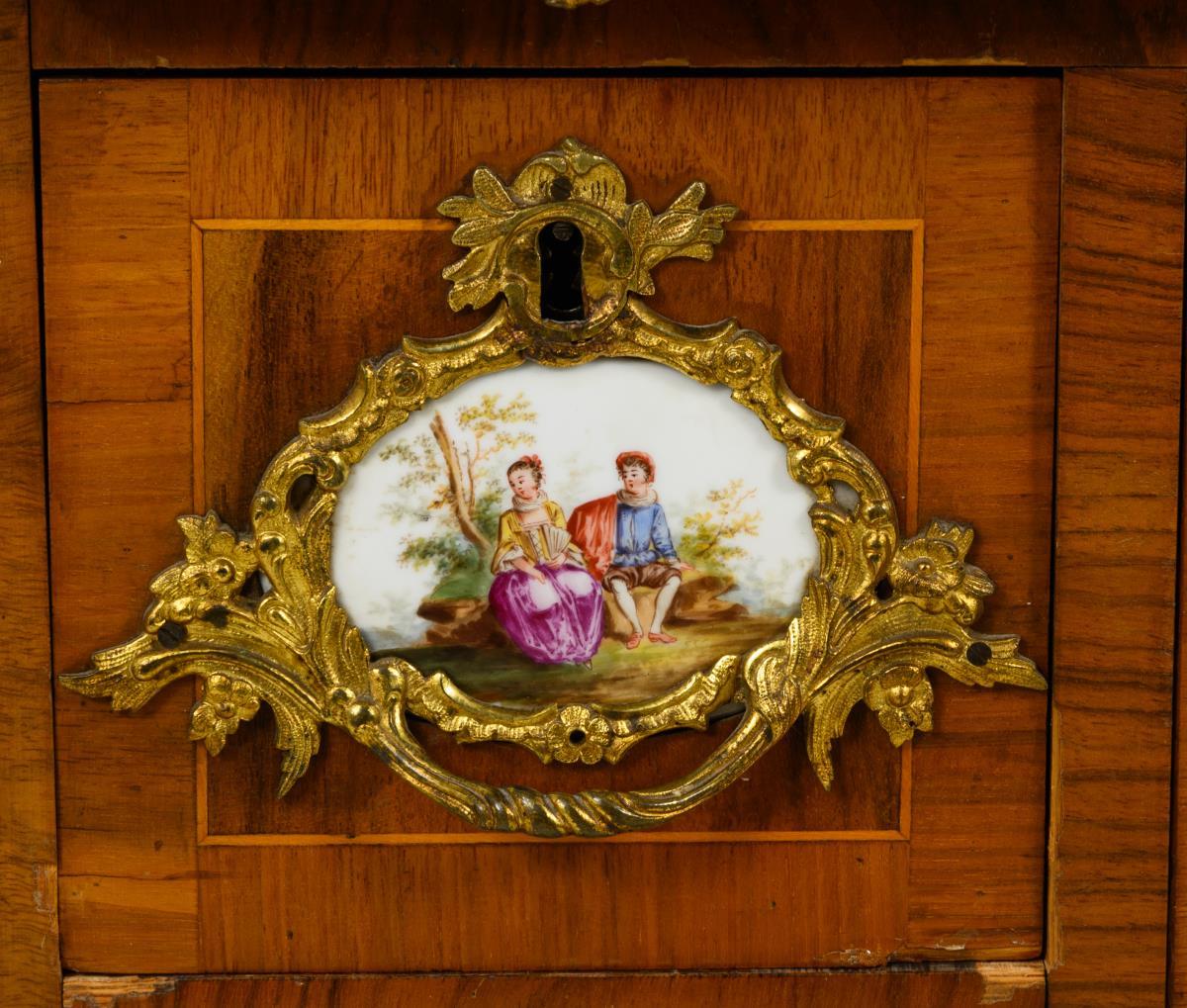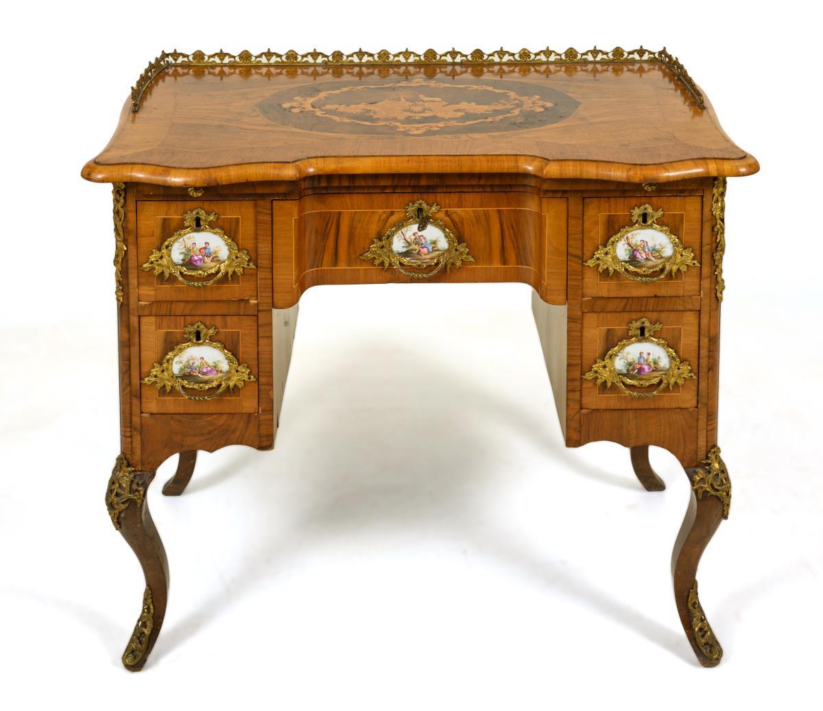 Dainty desk in a curved shape typical of the style with a leg recess and pull-out writing surface with green cover, central drawer and 2 small drawers on each side; richly decorated table top with fine marquetry with hunting scene and brass gallery, painted porcelain plaques with gallant scenes on the drawers, framed by rocaille fittings. Signs of age/wear, veneer with small defects.