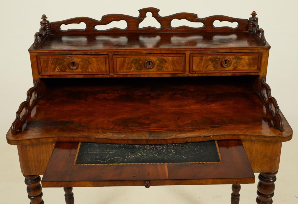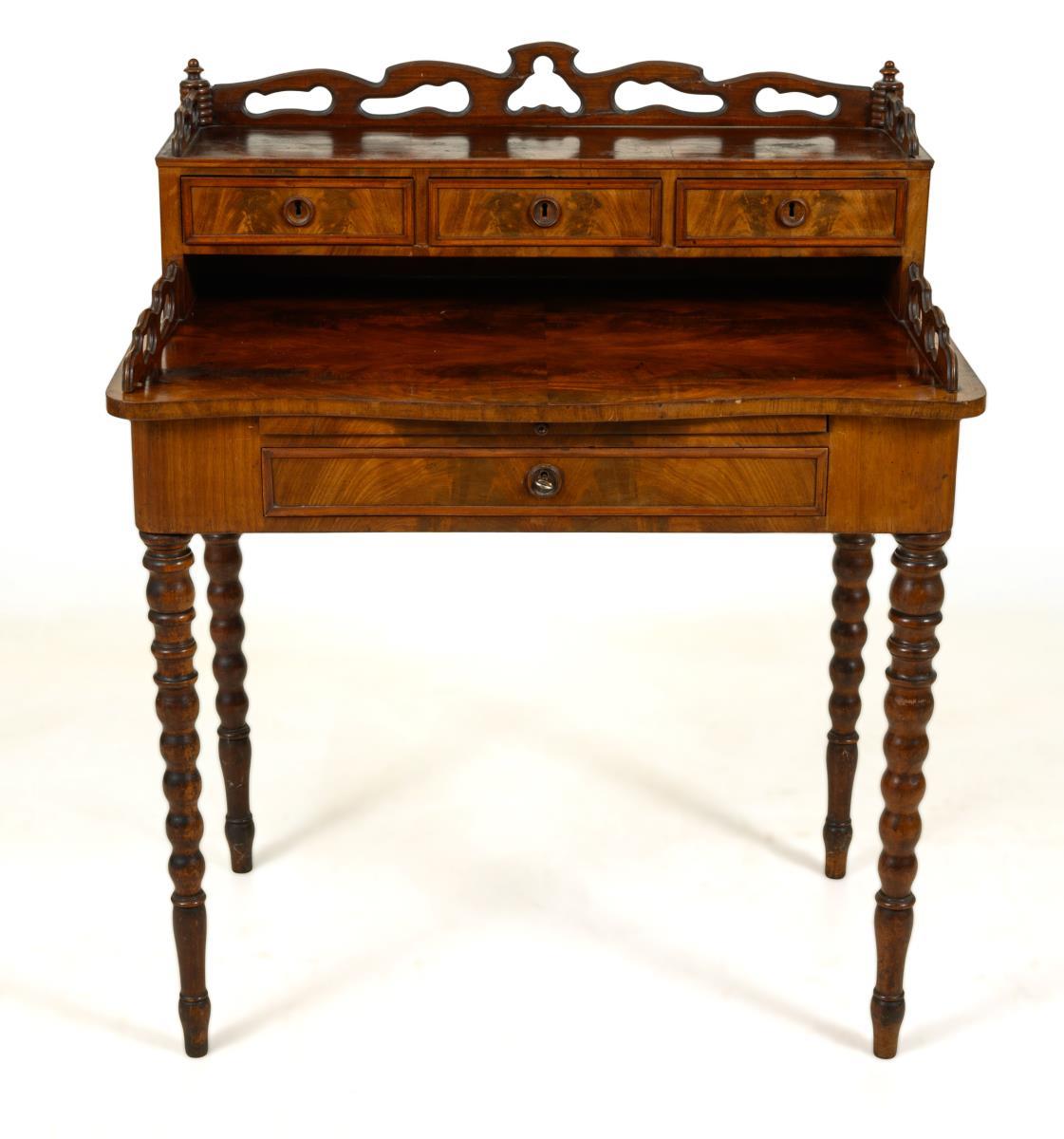 Delicate ladies' desk with 3-tier top, on 4 turned legs, pull-out writing surface with green leather cover, frame drawer; decorated with 3-sided surrounding, open-worked crowning. Signs of age/use, dry cracks, somewhat wobbly, applications partly loose.
