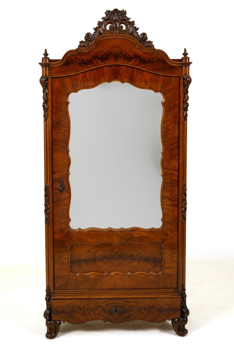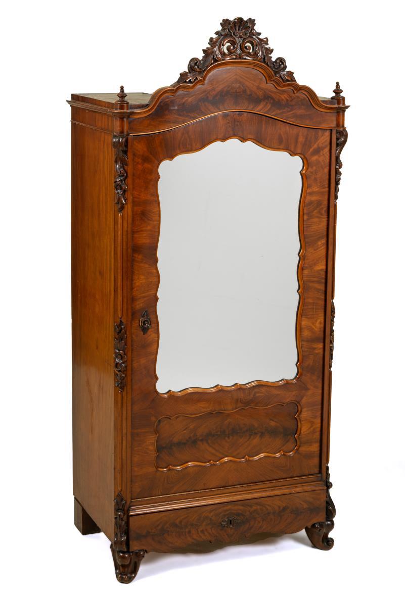 1-door cabinet with large mirror and pedestal drawer in a curved shape typical of the style, decorated with openwork crowning and relief carvings in baroque ornamentation; 4 shelves inside. Signs of age/use, veneer on the sides with small defects.