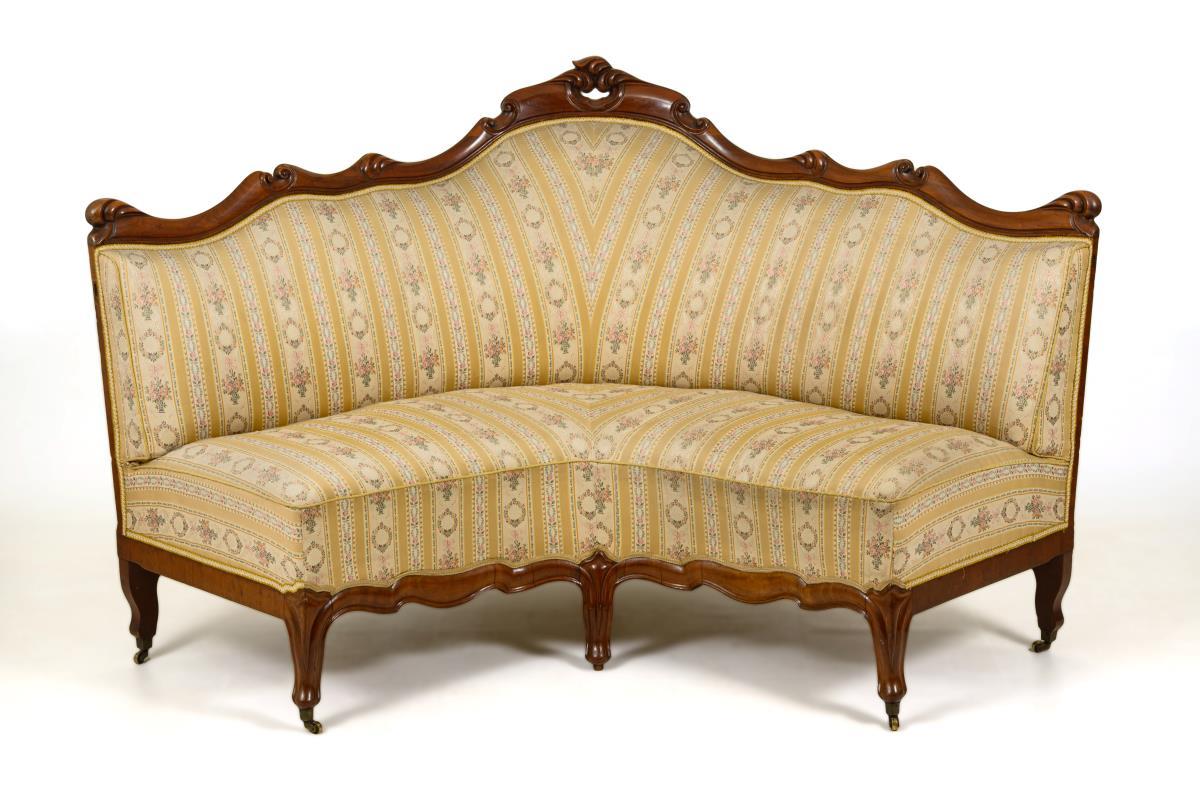 Fully upholstered, curved corner sofa without armrests, typical of the style, backrest decorated with rocaille carvings; light, champagne-colored striped cover with repeating flower bouquets and floral wreaths; on castors. Signs of age/use, dry tears, upholstery and cover replaced.