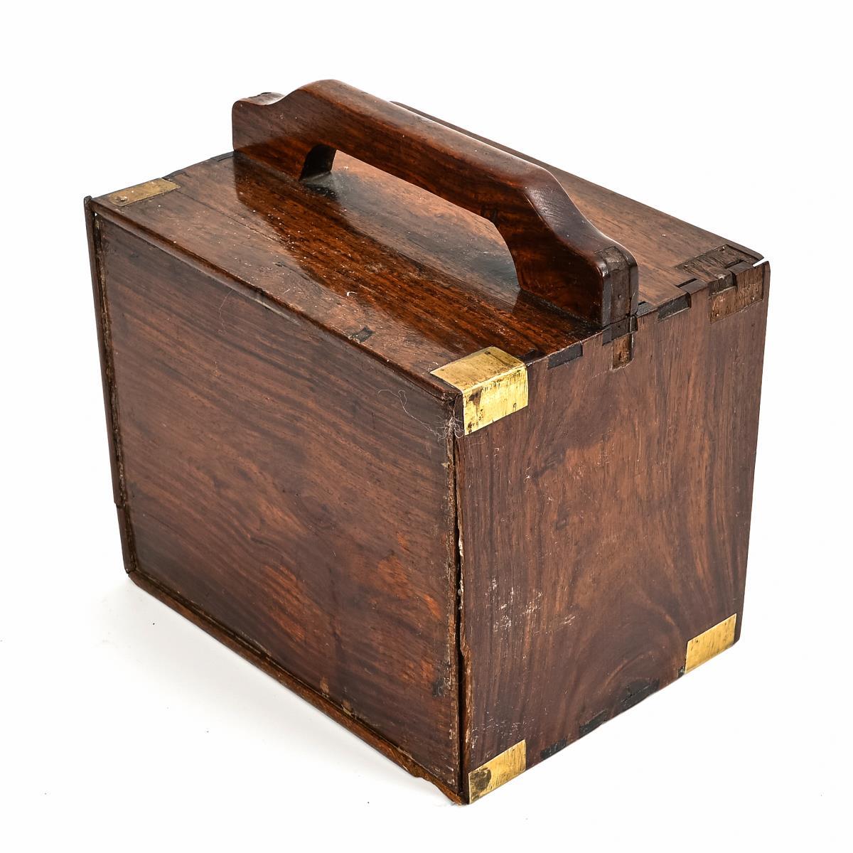 Case with carrying handle and edge fittings as well as removable front panel; behind it 5 drawers in the style of a cabinet. Some missing parts, minimal scuffing, small cracks and 1 spot of glue.