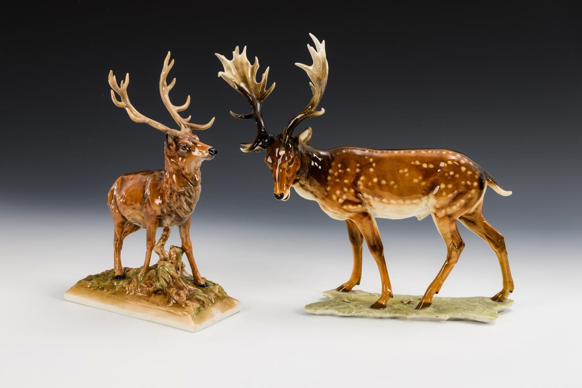 1x HUTSCHENREUTHER, from 1955, model no. 2828, design 1964 by Gunther Granget (1932-2010), marked: Fallow deer with inserted antlers (h 33.5 cm). / 1x NYMPHENBURG, 20th century, model no. 524, design 19th century by Sebastian Habenschaden (1813-1868), remodeled from 1914: stag standing on a forest floor plinth (h 30 cm). 2 tips of an antler blade of the fallow deer restored.