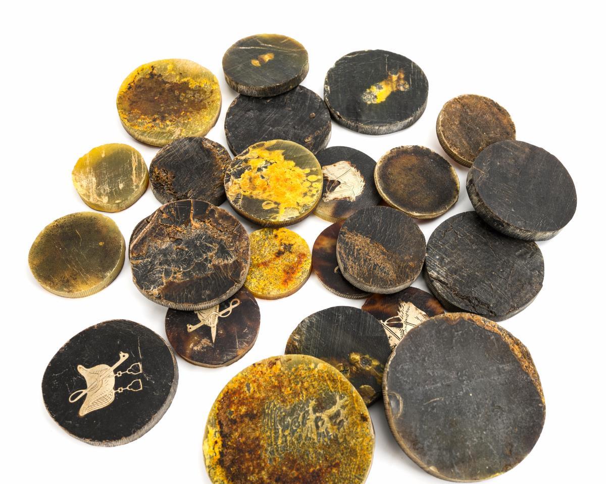 Black horn or light horn, each with silver-colored metal or bone inlay. Box with gold-decorated flower picture. Ø tokens 2.5 - 4.5 cm, box 5.5 x 15 x 10.5 cm.