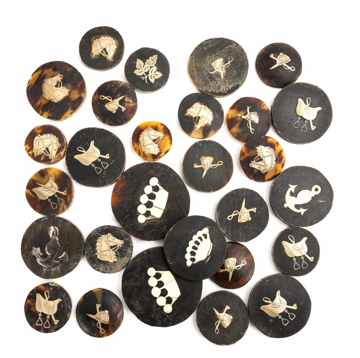 In an additional box with round tokens of different sizes, each with embedded symbols: crown, horse's head, saddle, riding hat, anchor. Strong signs of age/use, 1 inlay missing.