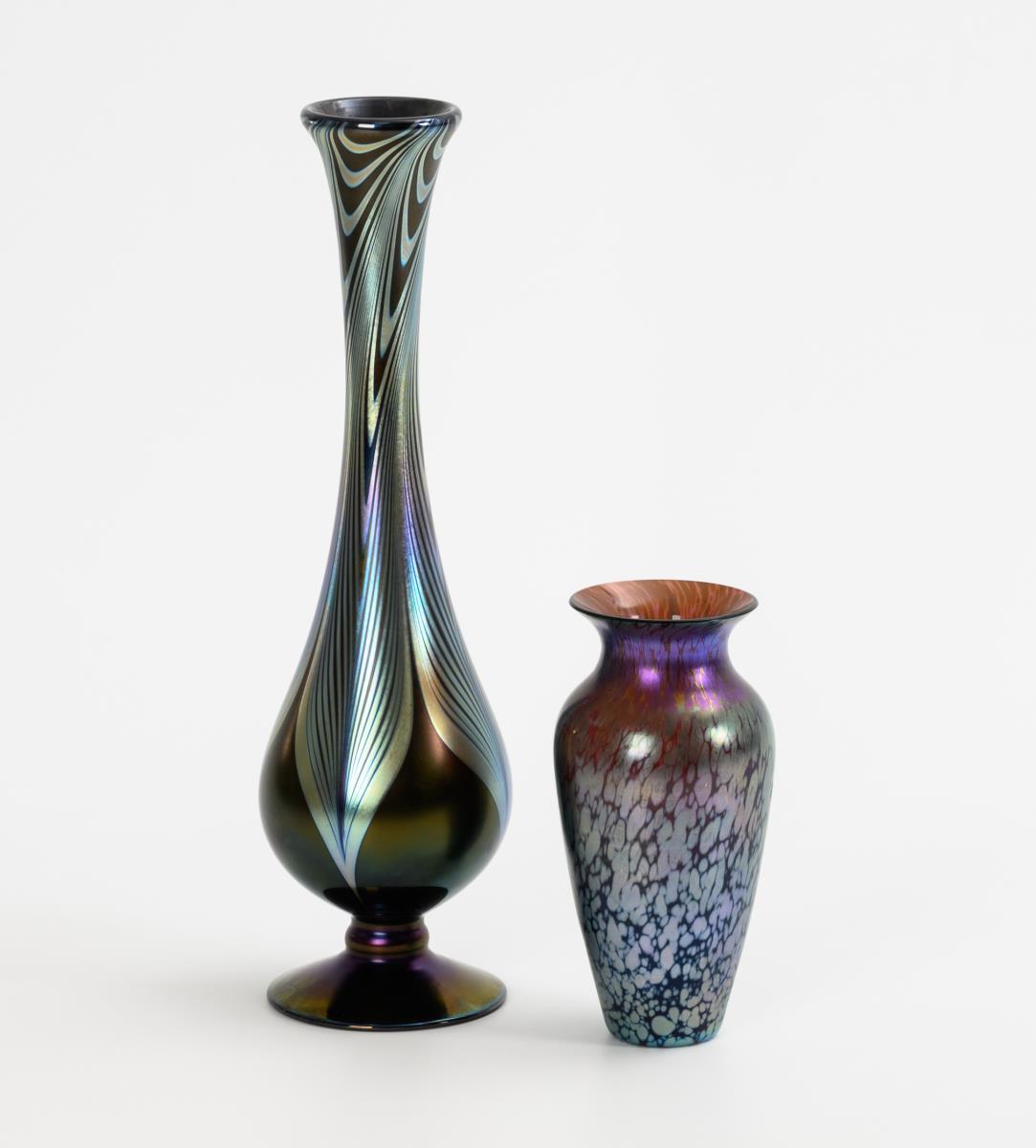 1x "Rubin Papillon", Lötz, 1898: baluster vase made of pink glass with fused silver-yellow crumbs, iridescent (h 16.5 cm). / 1x 2nd half 20th century: narrow-necked vase in Art Nouveau style made of black opaque glass with silver-yellow, feather-like combed thread decoration, iridescent (h 34 cm).