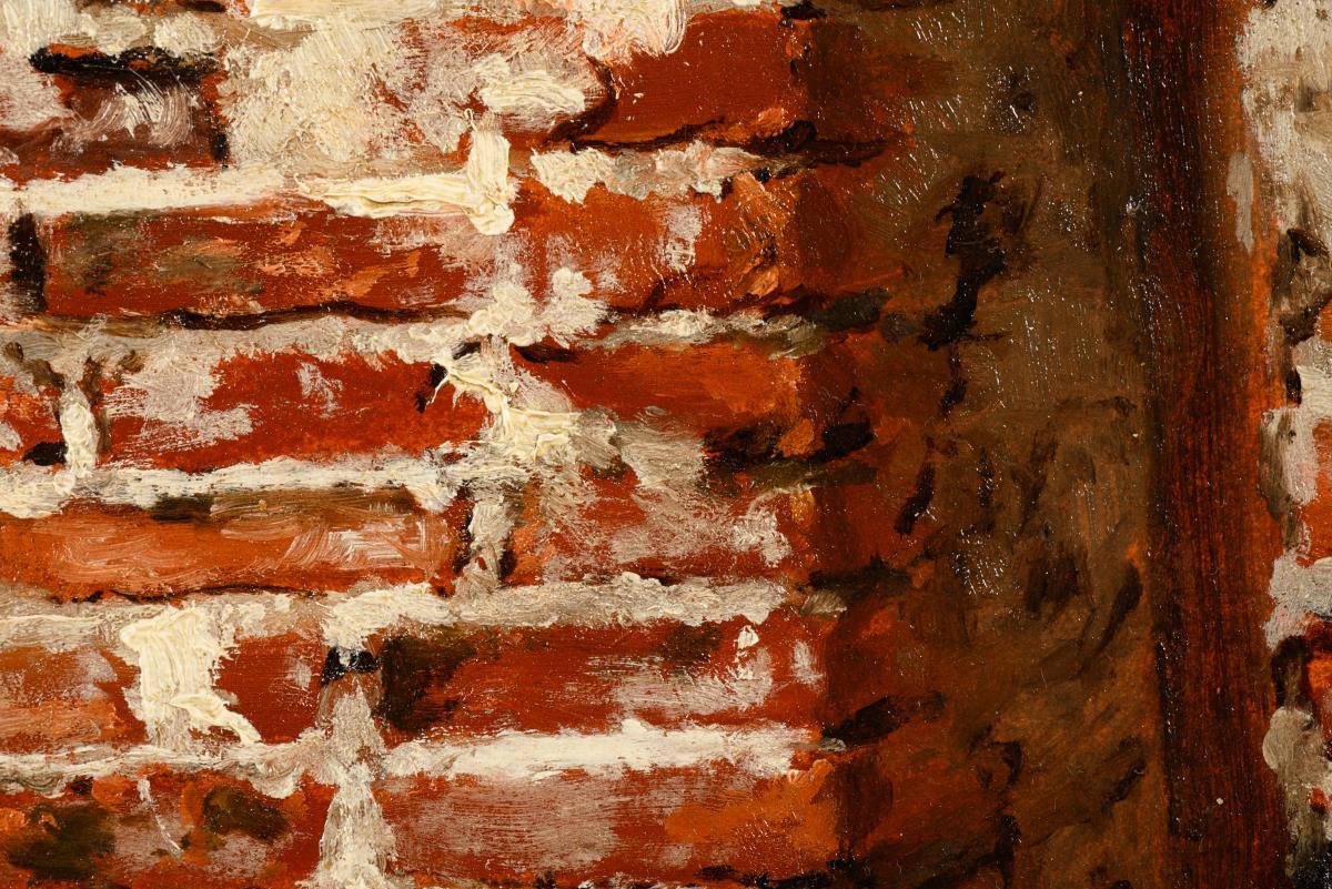View of a partly plastered brick wall inside a building. Small pinholes in the corners and at the edge of the paper.