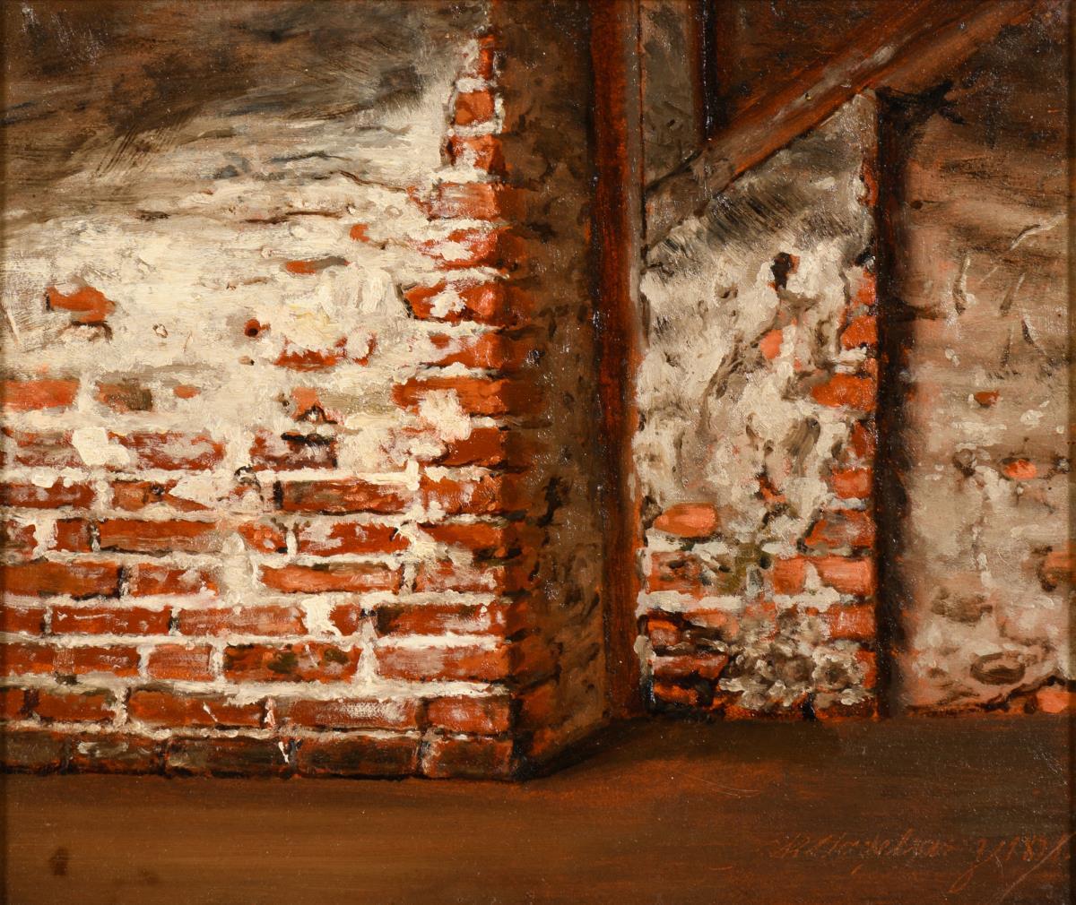View of a partly plastered brick wall inside a building. Small pinholes in the corners and at the edge of the paper.