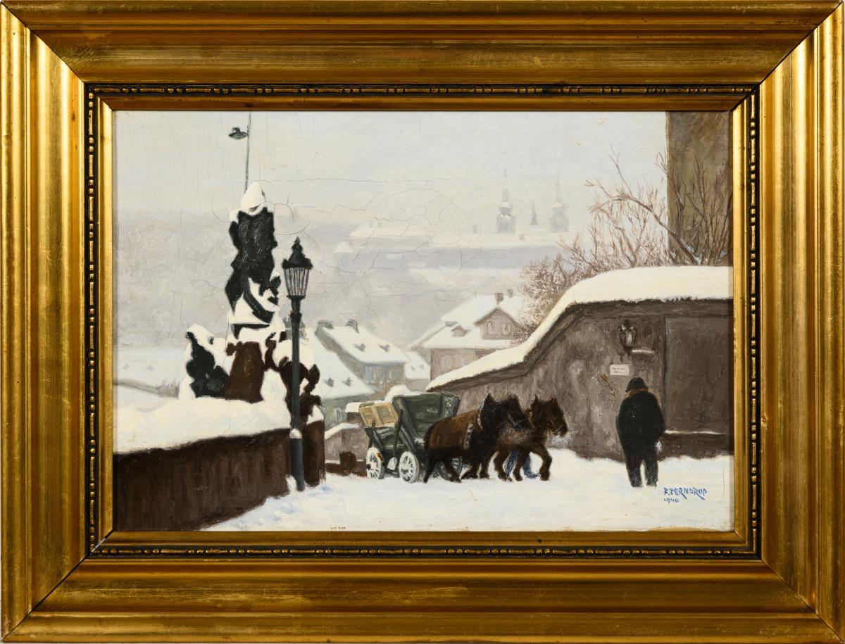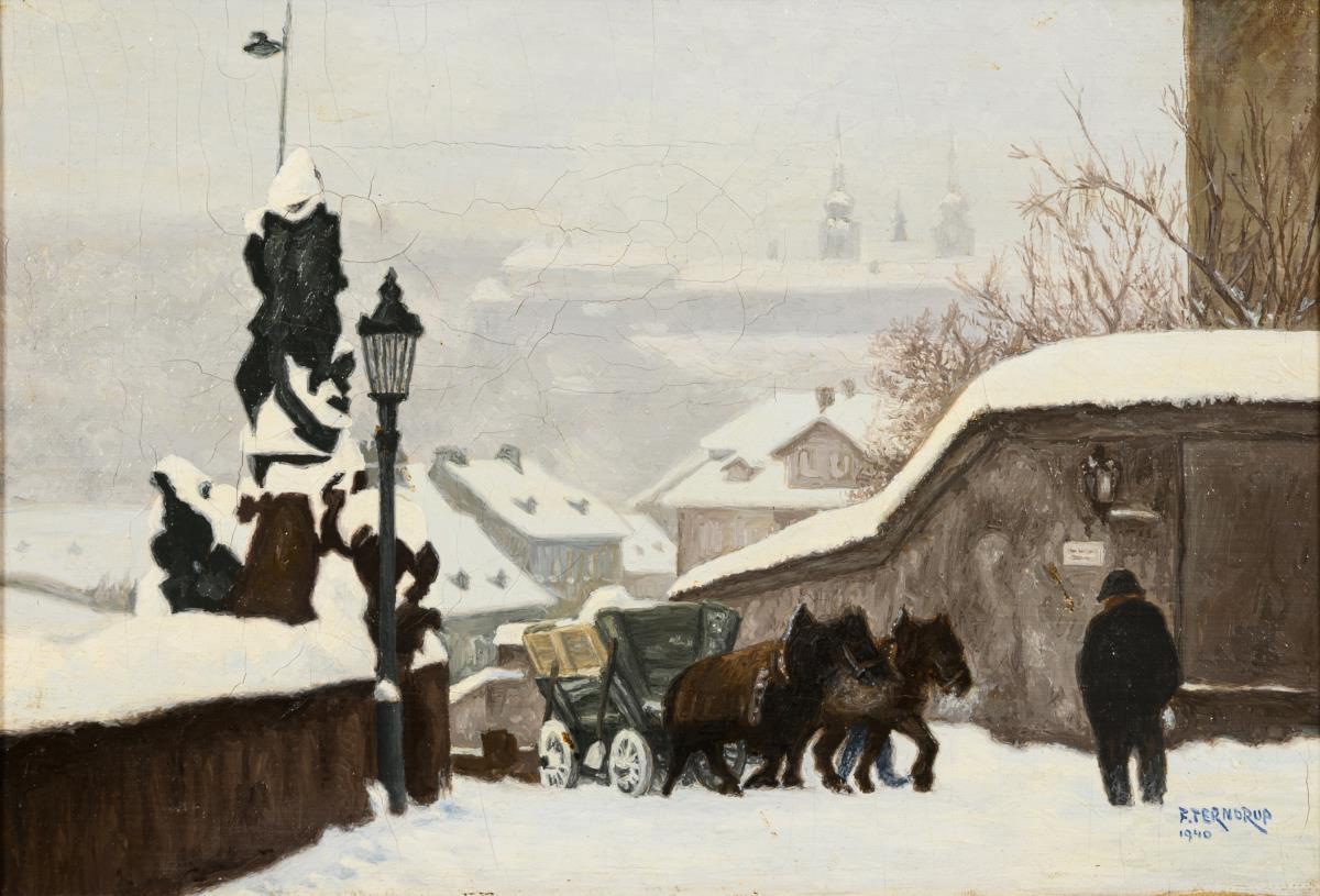 Snowy city view with horse-drawn carriage and view over the roofs to the dimly recognizable castle on the horizon. Minimal traces of age.
