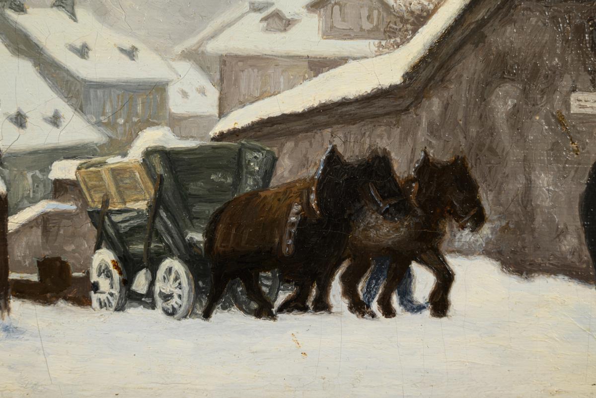 Horse and cart in a snow-covered town