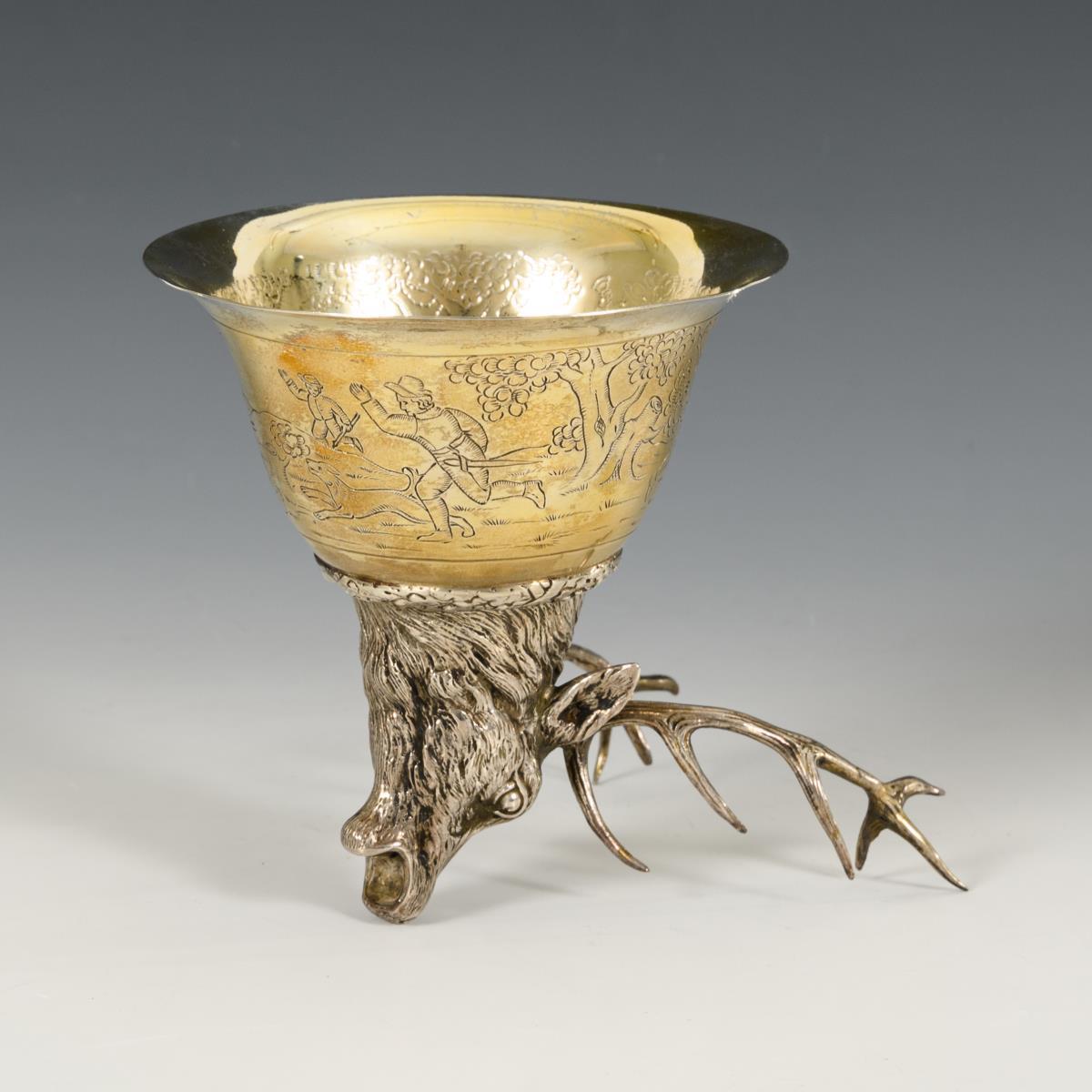 Cup with sculptural stag's head. Cup minimally dented, antlers slightly bent at one end.