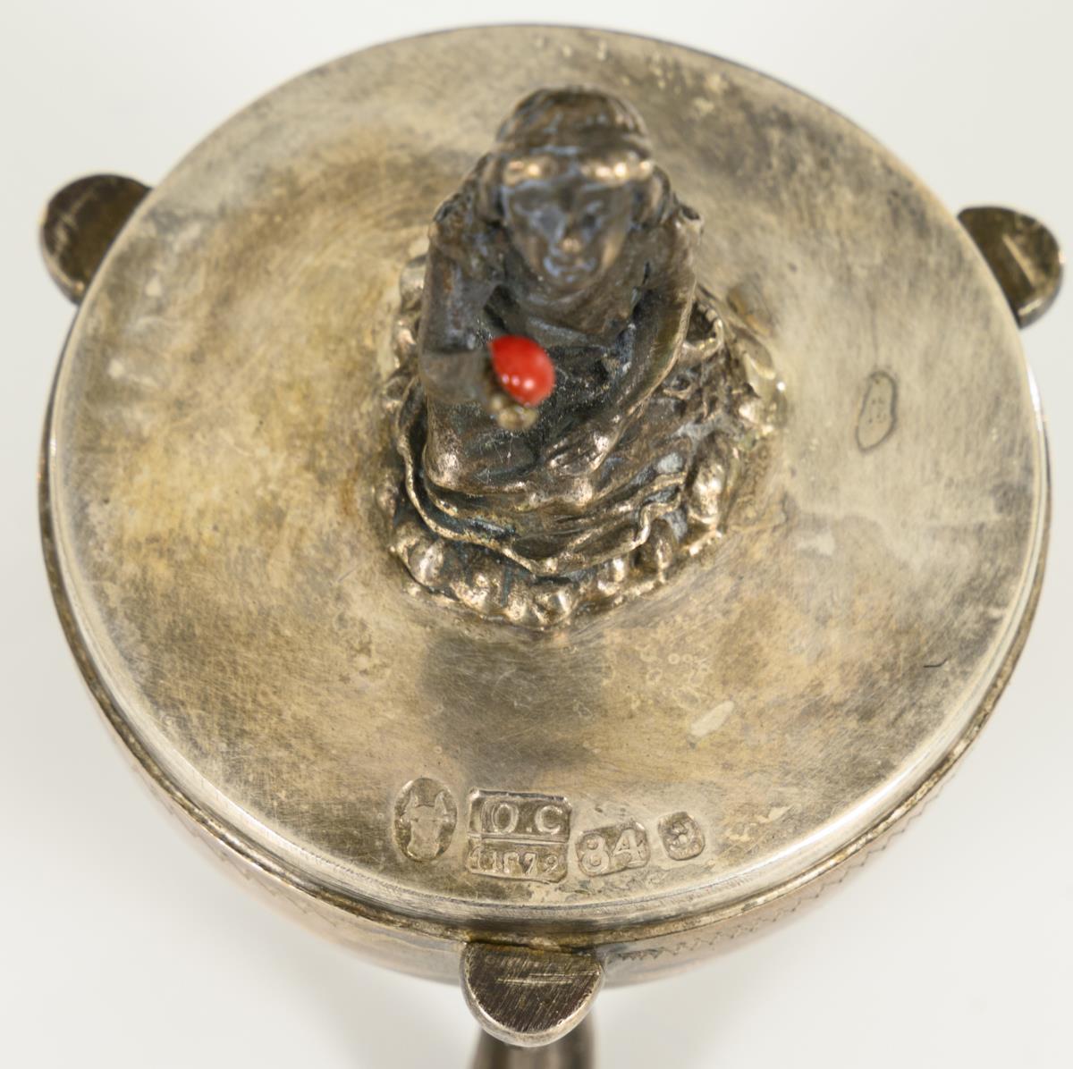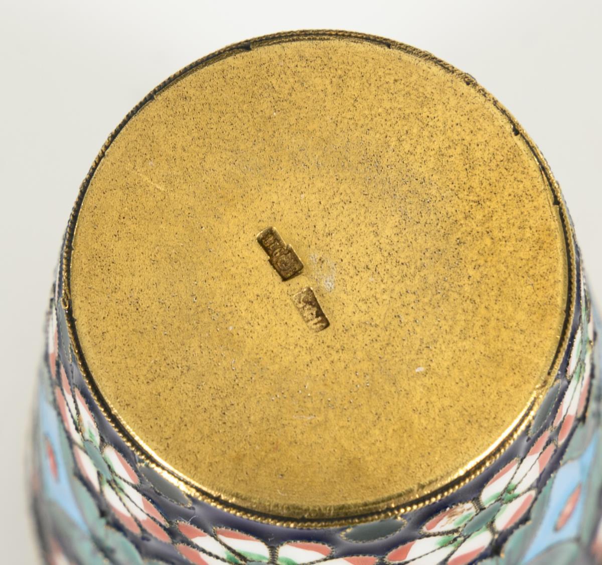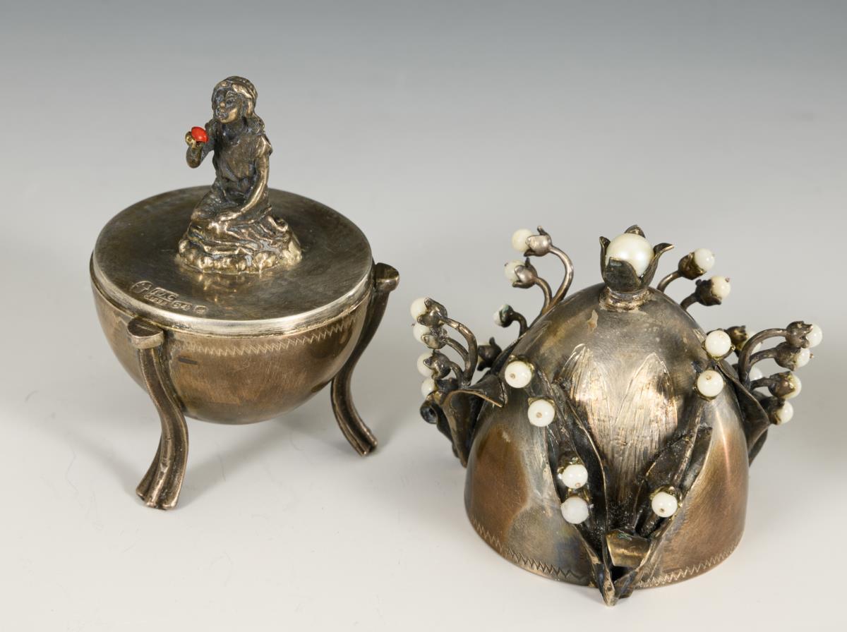 Silver egg with pearl-like flower decoration on the lid, inside kneeling girl figure. With defects, 2 pearls missing. H 9 cm. / Colored enameled vodka cup, gilded inside. H 5 cm. / 6 silver demitasse spoons with green and red enamel decoration. L 11.5 cm. In brown case.