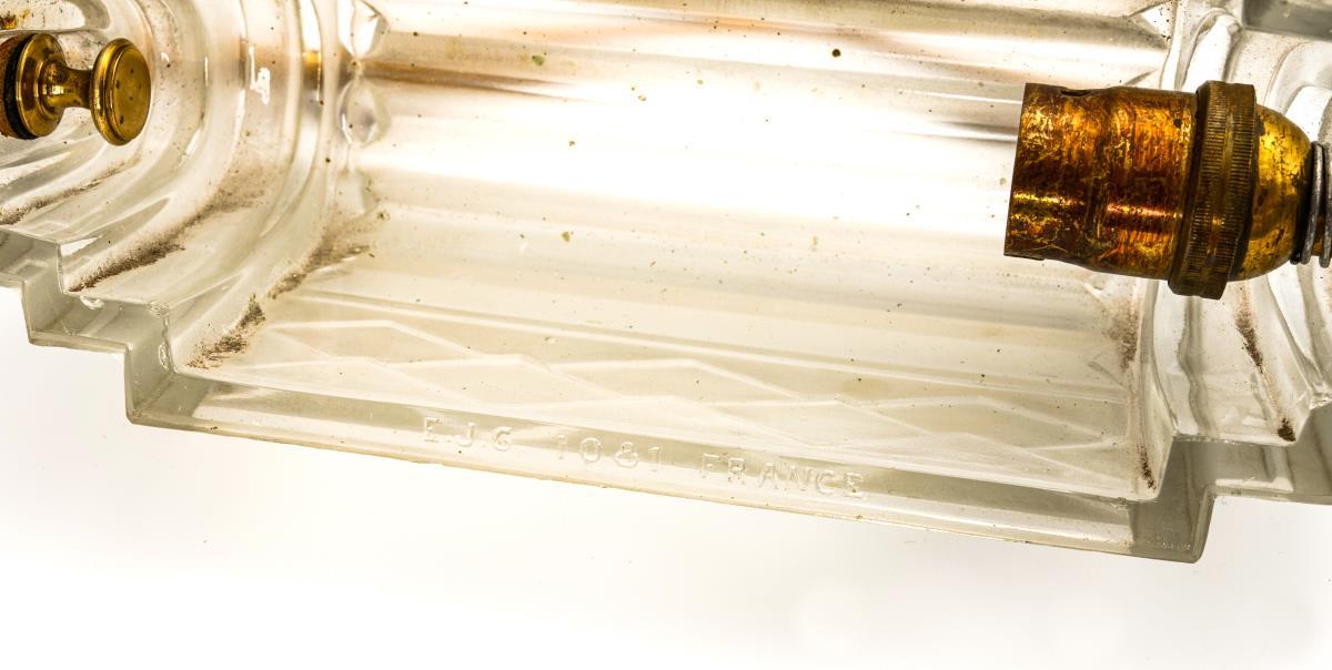 Brass, gold-bronzed, clear molded glass, satin finish, bayonet mount. H 38 cm, W 28 cm.