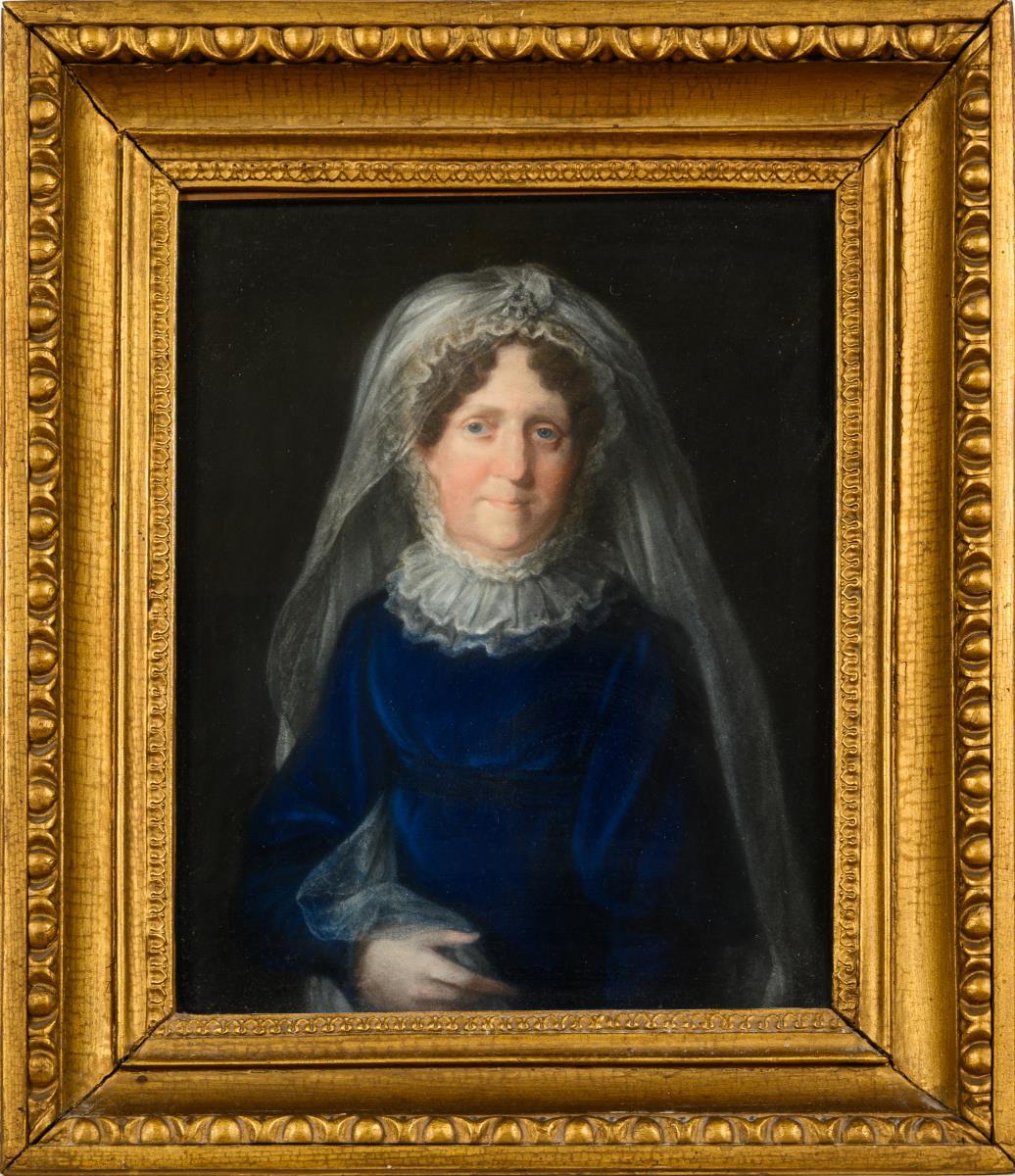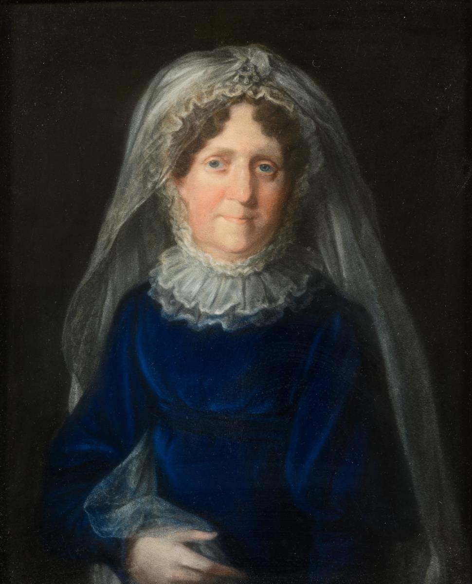 Portrait of an elderly woman in a bright blue dress with a transparent veil in her hair.
