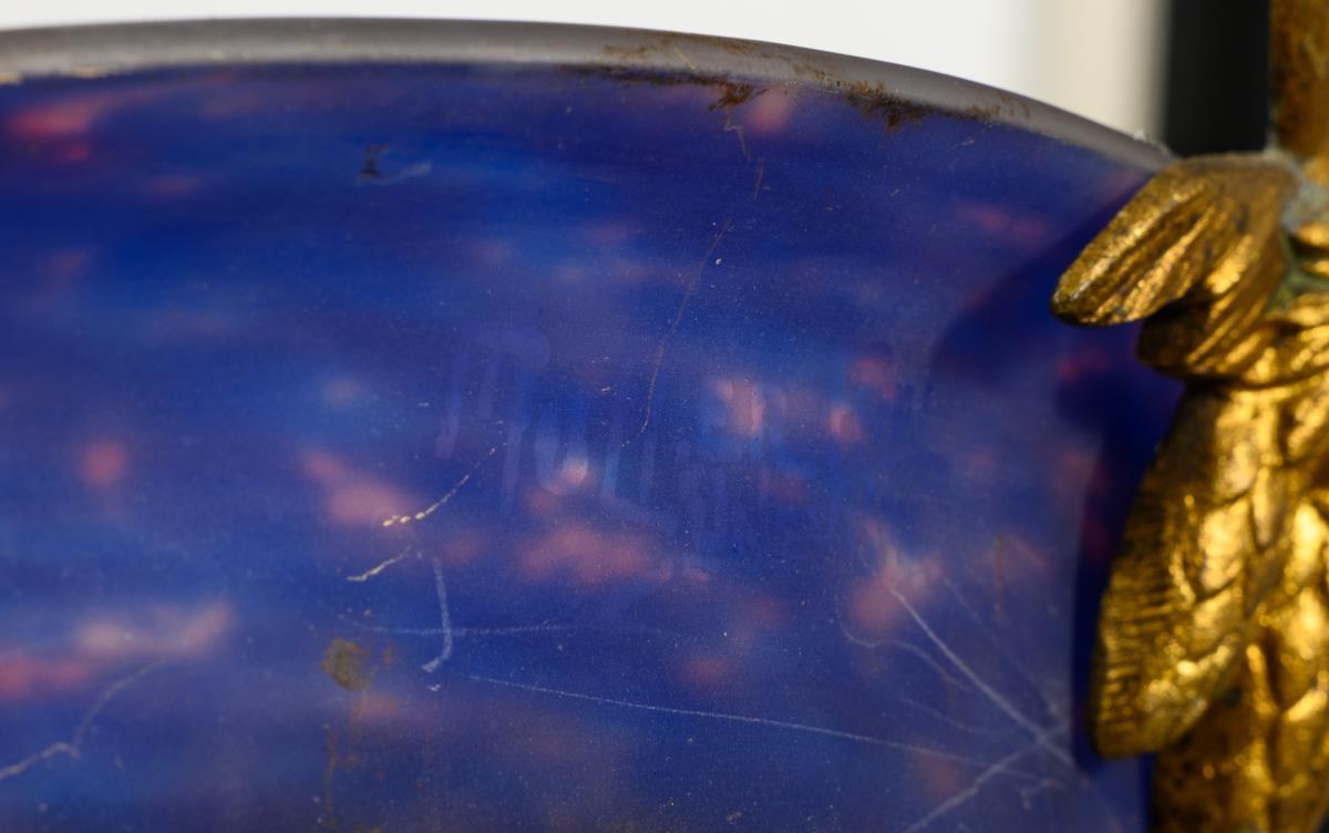 Colorless frosted glass with orange and blue powder fusions, bronze, bayonet mountings. H 75 cm, Ø bowl 39 cm.