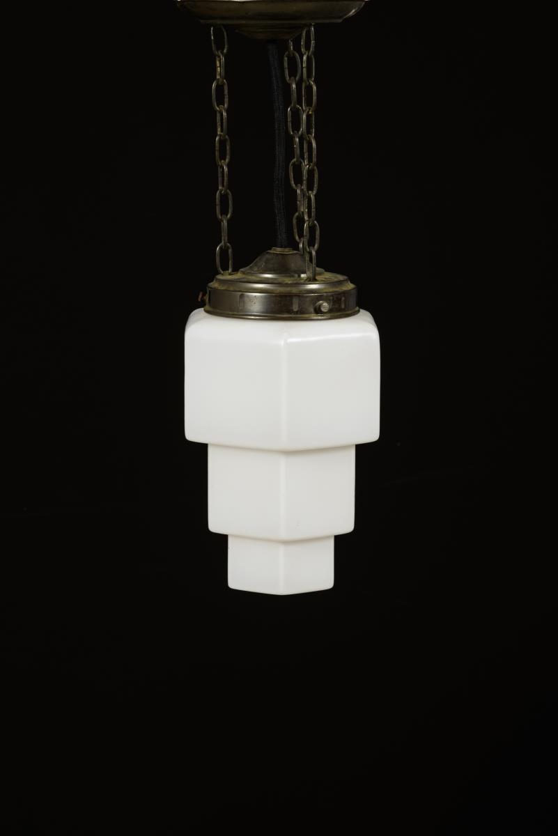 2-tiered, hexagonal glass shade with simple holder as well as 3 chains and canopy. Metal somewhat stained. Electrified, function not tested.