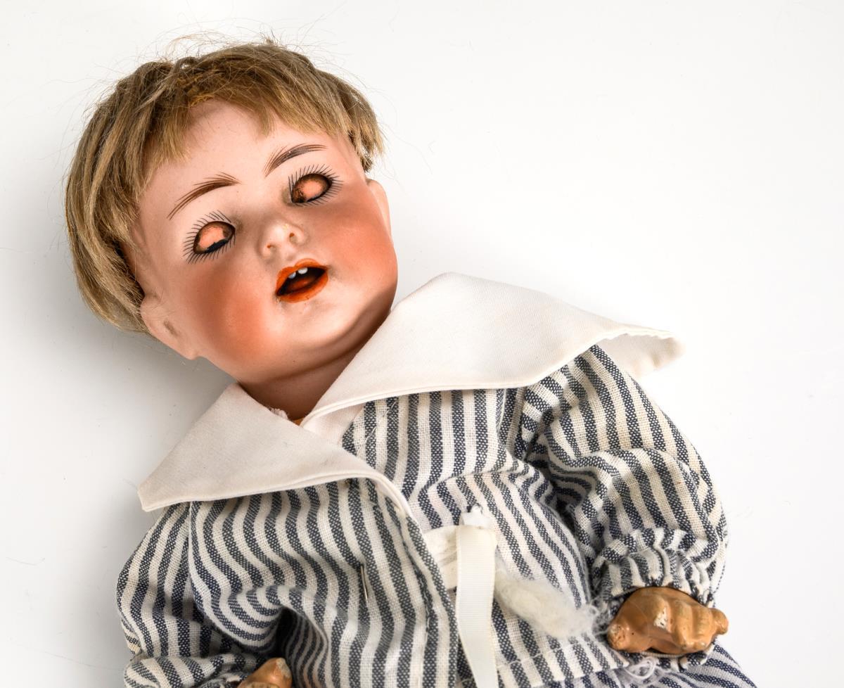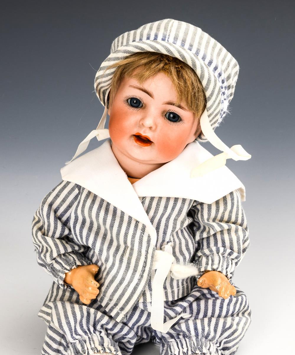 Cranked head, blue sleeping eyes, blonde mohair wig with defects. 5-part sitting baby body. Striped suit, matching bonnet. Head x-rayed: without cracks, only small chips on the crown of the head. Small bruises on fingers and toes, left ankle broken.