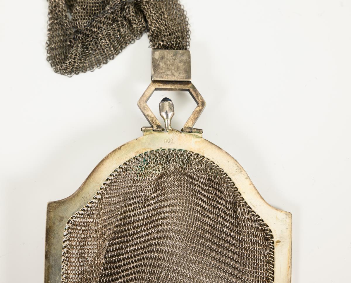 Small art deco bag with hand strap and blue stones on the clip. Small defect in the fabric.