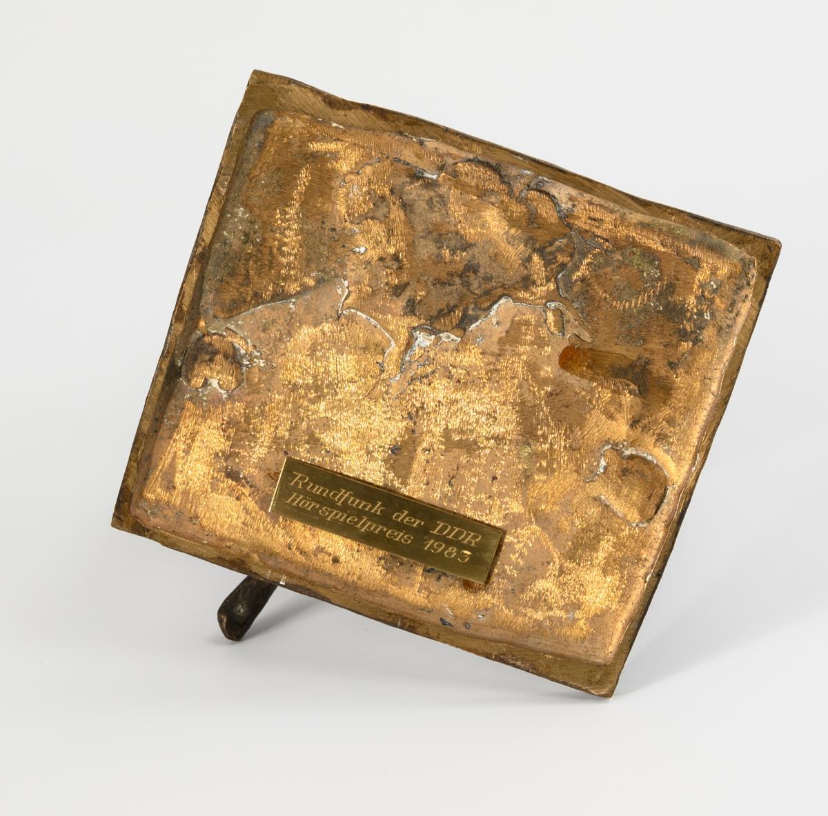 Bronze patinated. Inscribed/dated with monogram (19)76, brass plaque "Rundfunk der DDR, Hörspielpreis 1983" affixed under the plinth. H 32 cm. 7.5 kg.