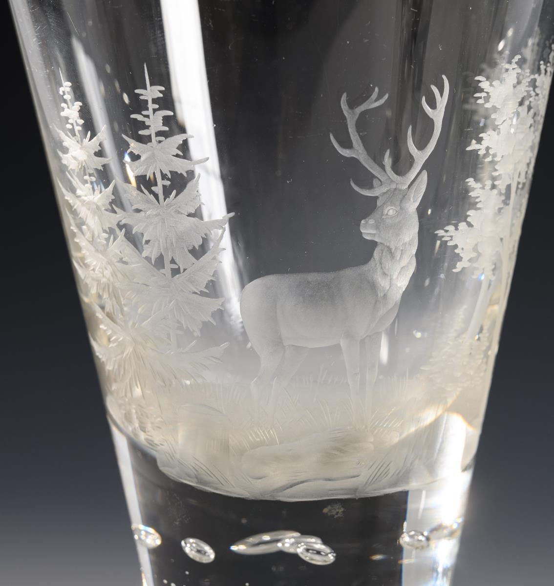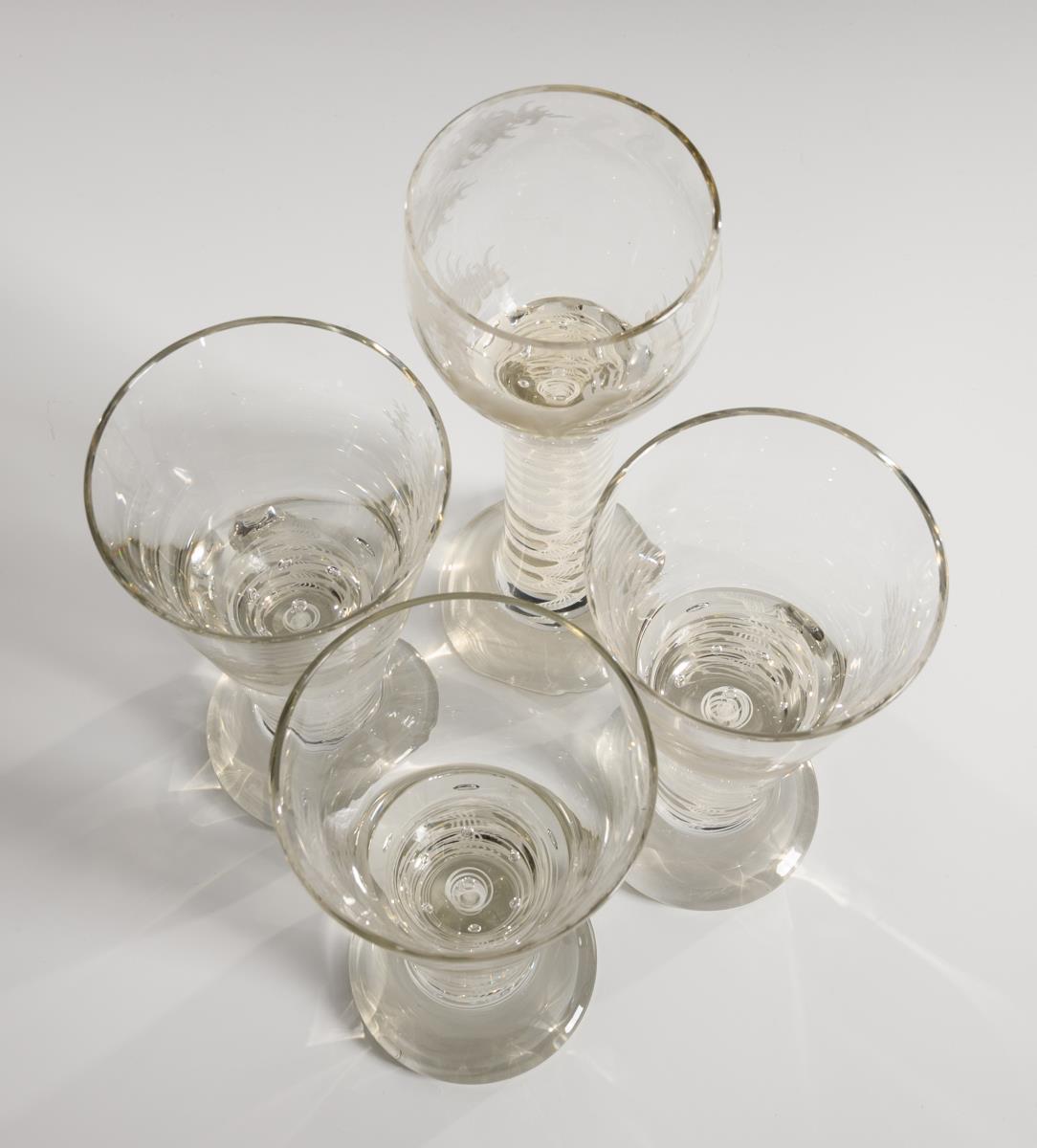 3x with conical and 1x with bulbous dome, with a pierced bubble wreath at the base of the dome, white spiral thread in the stem and round foot. Engraved hunting motifs on the dome.