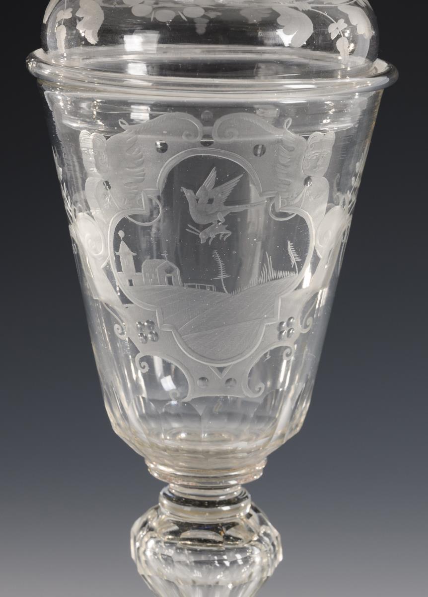 Conical dome, supplemented knob lid, honeycomb-facetted baluster hollow shaft, round foot;; demolition. On the front an engraved quatrefoil cartouche depicting a landscape with a flying bird carrying a captured hare in its wings.