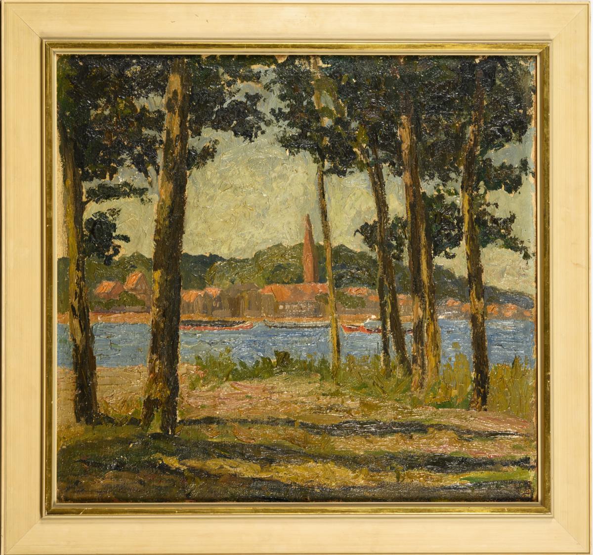 View from the bank across the river to a village with a church in the sunshine. Slight traces of age.