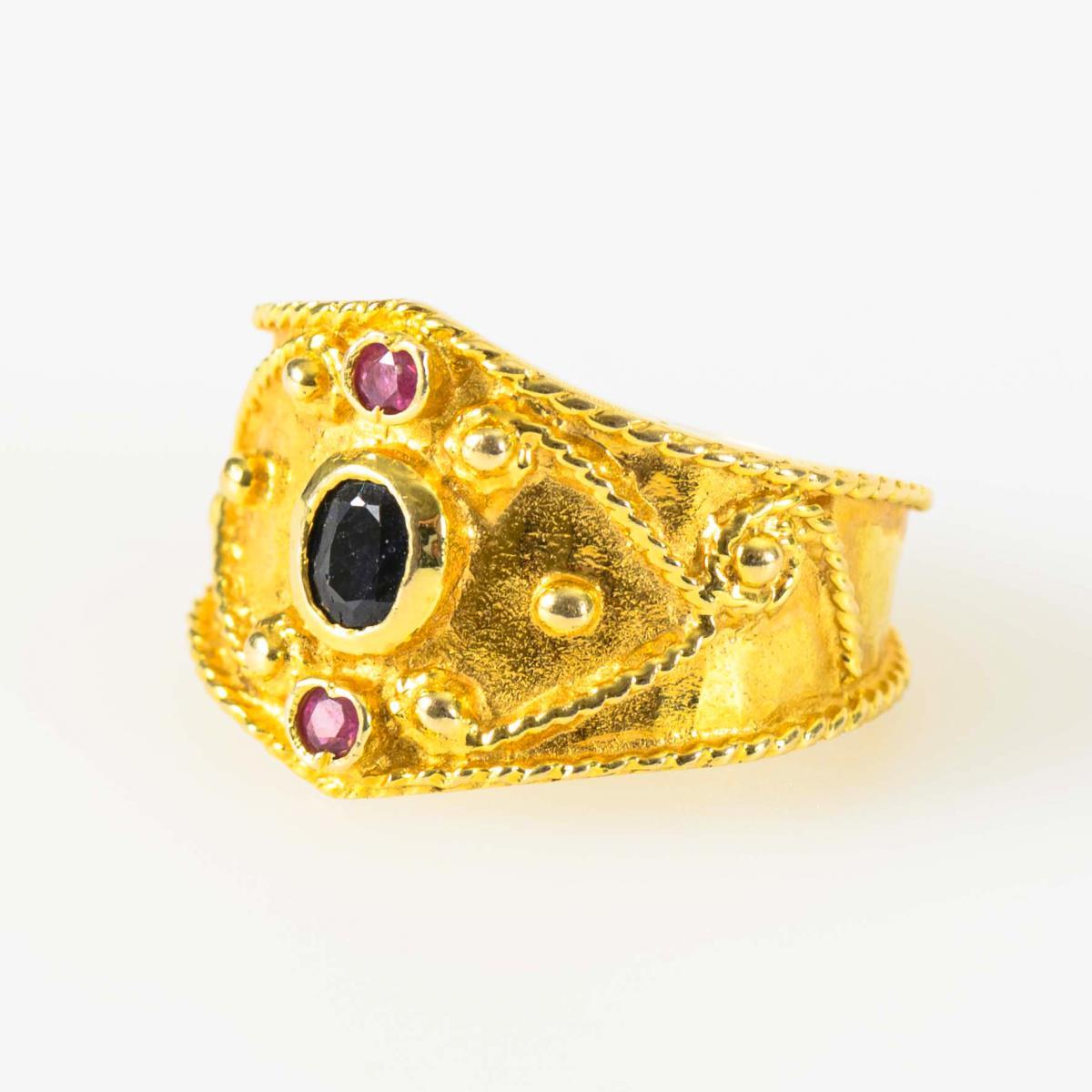 Ring with sapphire and rubies.