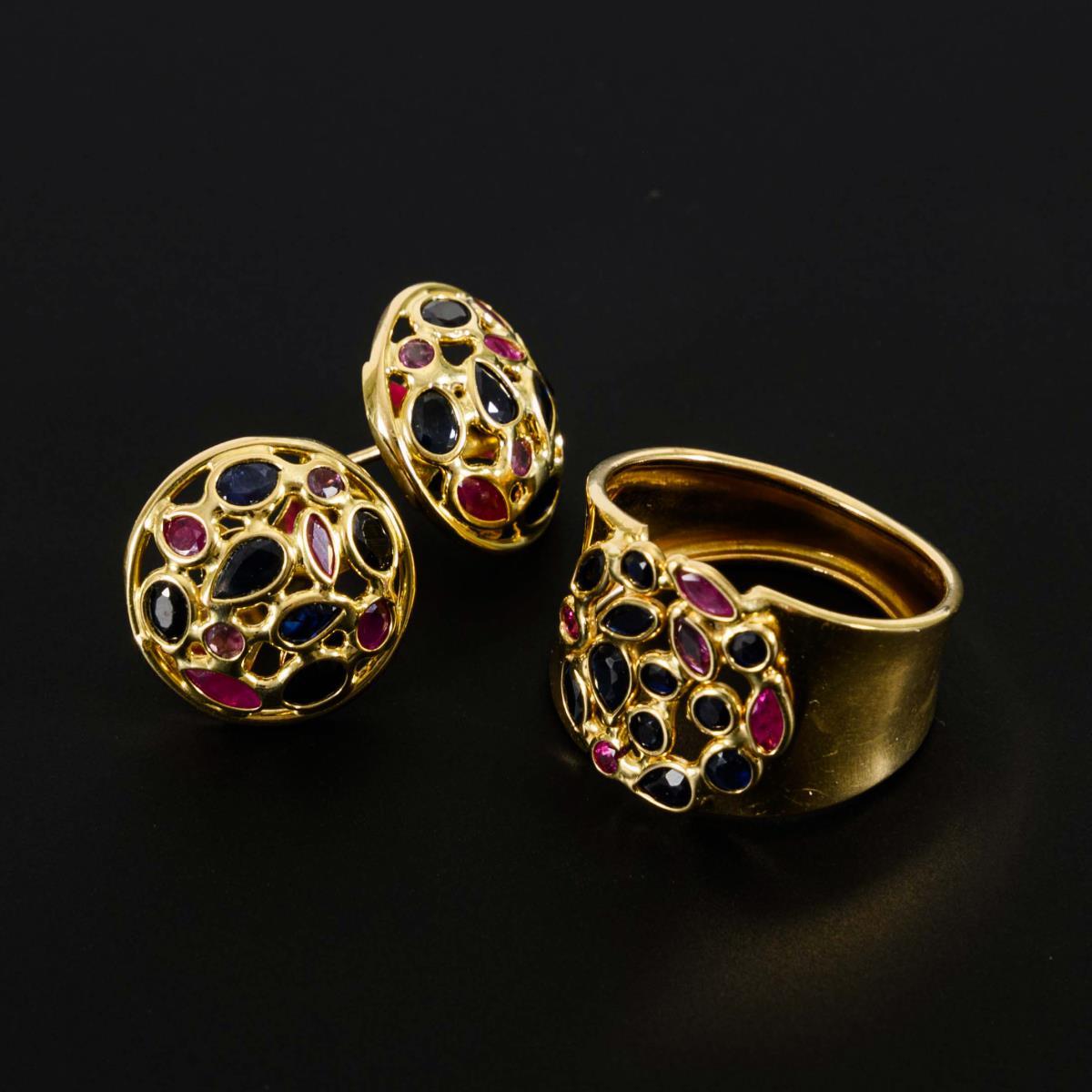 Broad hoop and pair of ear studs with bezel-set rubies and sapphires. Pin mechanism.