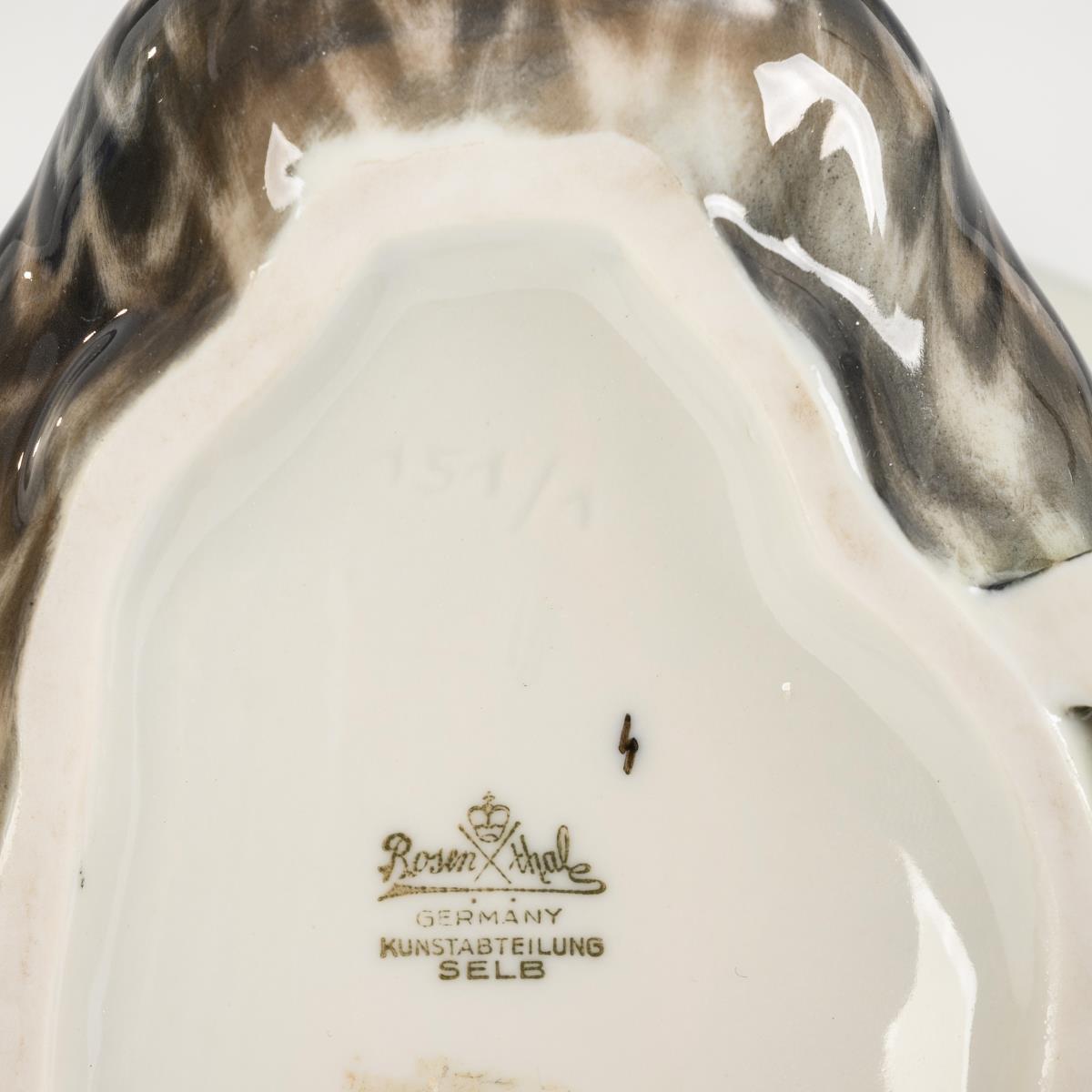 "As a freelancer, Willy Zügel had already produced designs for the porcelain manufactories Meissen (1906) and Nymphenburg (1911 - 1913), before working for the art departments of the Rosenthal porcelain factory in Selb and Bahnhof-Selb from 1911 to 1926. Following in his father's footsteps, Zügel always worked from live animal models, which he created at the Murrhardt Wolkenhof - the family's summer residence -, in Munich's Hellabrunn Zoo or in zoological gardens abroad. zoological gardens. It is therefore not surprising that his animal figures in particular particularly reveal the artist's familiarity with the animal's soul. His duck pair clearly reveals his excellent anatomical knowledge of animals. The duck is resting with its plump body and small head tucked in, while the drake to its left is standing upright, its flat beak and stretched neck pressed against its bulging chest, seemingly preening its feathers. Zügel has the typical character of the mallard, which is one of the largest of its genus in our waters. species in our waters, in a naturalistic way. The design for this group of figures in bronze was presented at the International Art Exhibition in Munich as early as 1910." (Petra Werner, in; Catalog: Auf der Pirsch - Jagdbare Tiere in Porzellan, Porzellanikon (vol. 117), Hohenberg a.d. Eger 2015, p. 31/cat. no. 16).