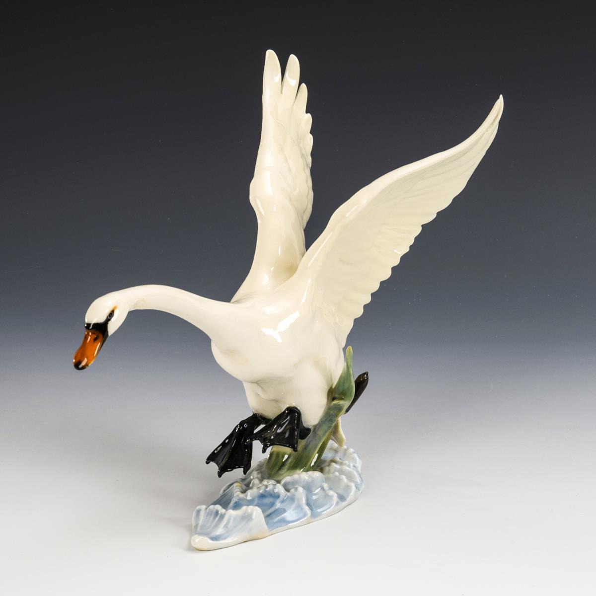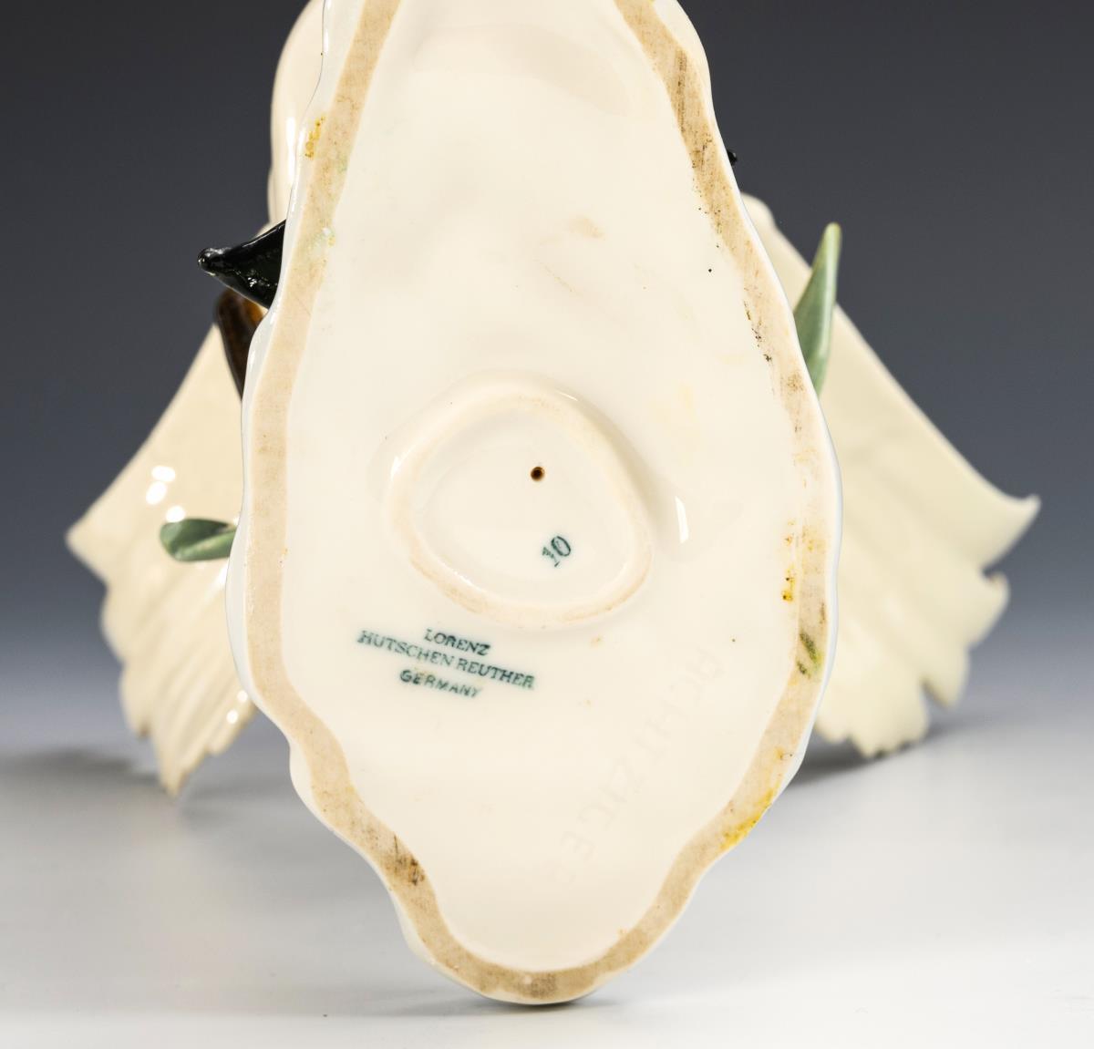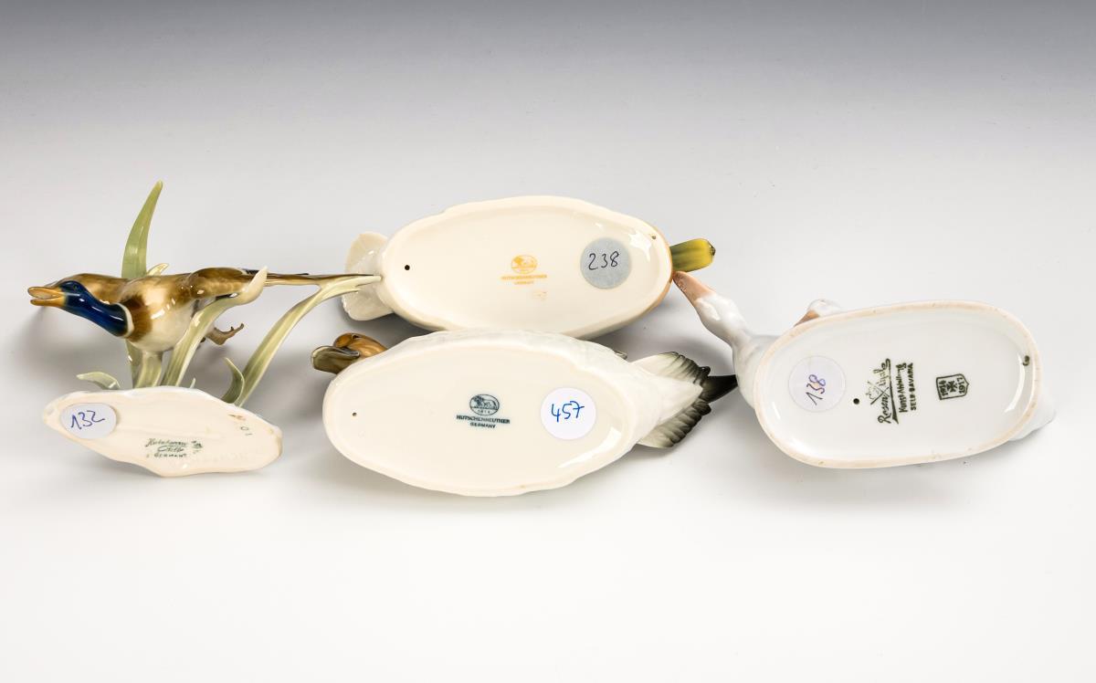 4x HUTSCHENREUTHER: flying swan (model no. 2303, design H. Achtziger, 1954; H 22.5 cm), flying drake (model no. 2163, design H. Achtziger, 1950; H 12.5 cm), duck (model no. 8831, design U. Netzsch, 1985; L 14 cm) and duck (L 15 cm). / 1x ROSENTHAL: Pair of ducks (model no. K 153, design K. Himmelstoss, 1912; h 7.5 cm). Swan: swan and leaves restored, 1 leaf glued; flying drake: 1 leaf restored.