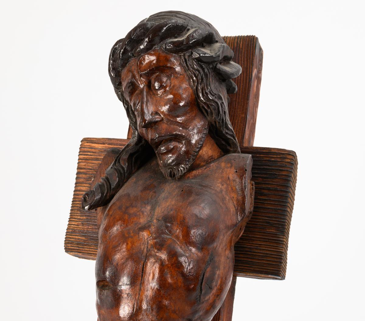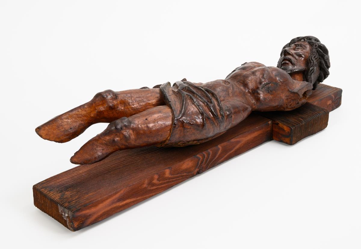 The dead Jesus Christ with a slender body and wrinkled loincloth mounted as a crucifix on a supplemented cross. Arms and lower legs missing, minor chips to the shoulders, dry cracks, few traces of anobia, paint removed, recently stained.