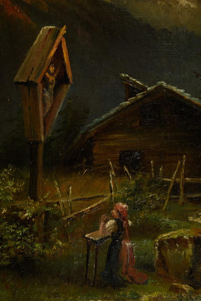 Woman praying in front of the shrine near the hut in the mountains. Slight traces of age.