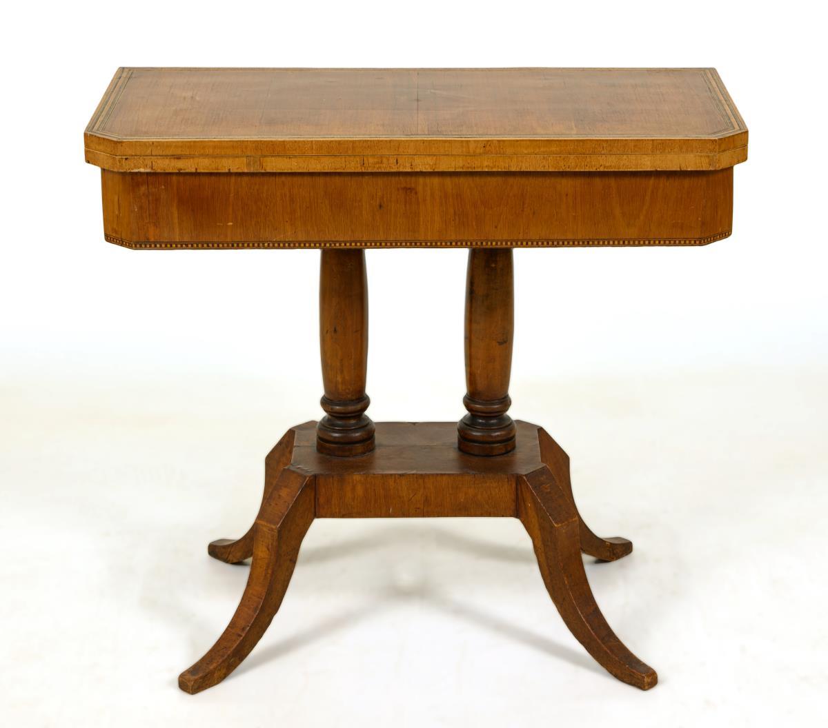 Delicate console folding table on column supports with rectangular base and 4 sabre legs, folding and rotating table top with frame storage compartment; discreetly decorated with circumferential toothed cut on the frame and circumferential meander on the edge of the table top. Signs of age/use, table top wavy, dry cracks, veneer with small defects.