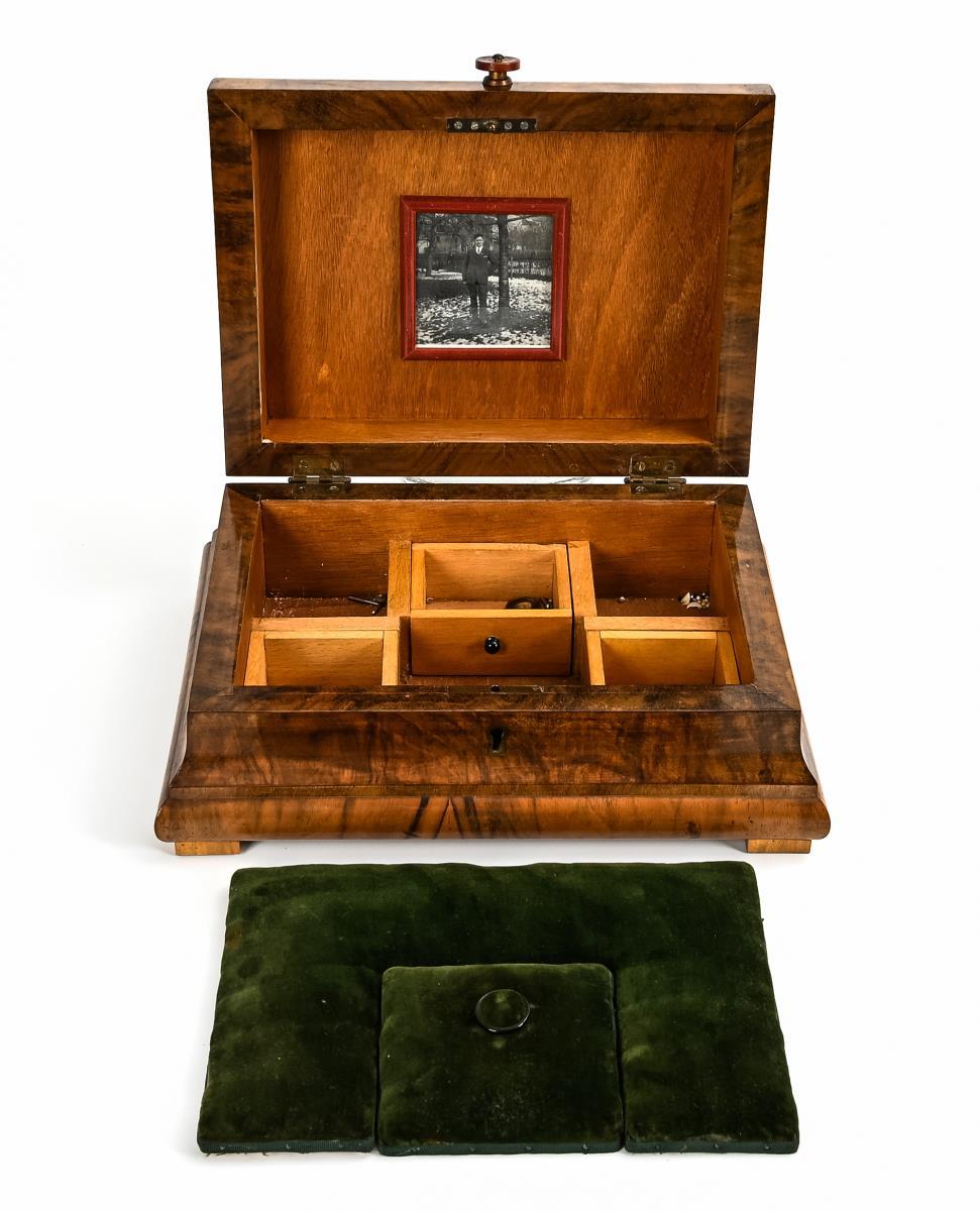 Casket with hinged walls and hinged lid with amber-colored plastic handle. Inside green velvet cushion over 3 compartments; framed photo in the lid.