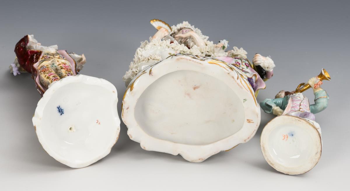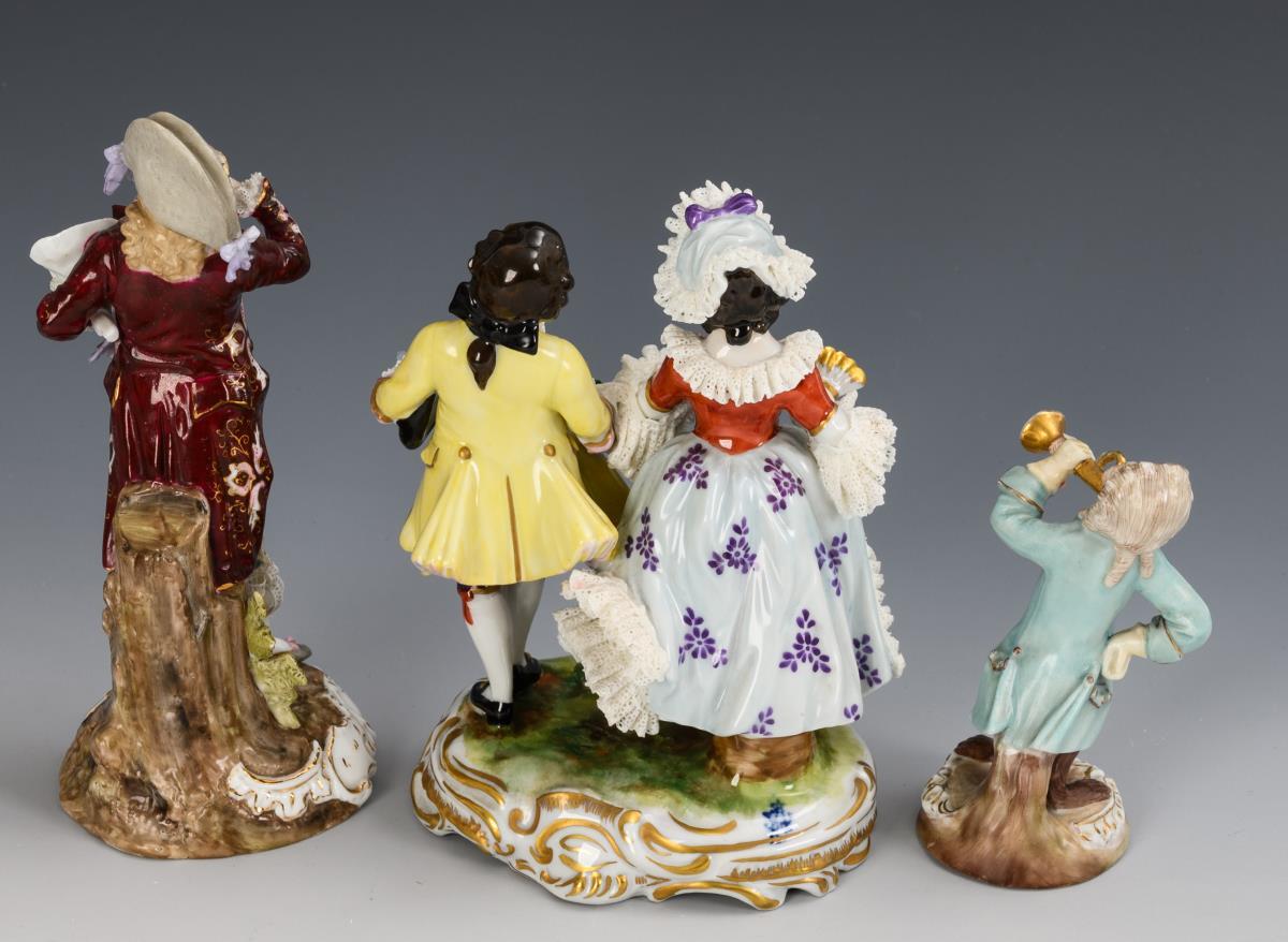 1x Aelteste Volkstedter: Girl as rococo lady in lace dress and boy as cavalier (H 16 cm). / 1x Triebner, Ens & Eckert: Young man as cavalier with bouquet of flowers (H 17.5 cm). / 1x Schierholz: Monkey as a trumpeter (H 10.5 cm). Tip bumped, cord of the trumpet bumped.