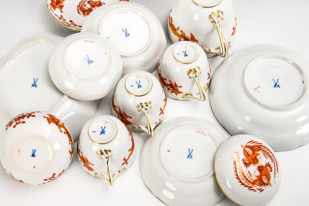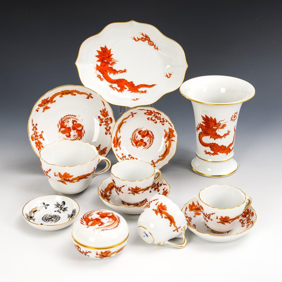 "New cut-out" shape. 11x "Red Dragon": crater vase (H 14 cm), 3 demitasse cups with 3 saucers, 1 coffee cup with saucer, 1 box (Ø 7.8 cm) and 1 quatrefoil bowl (L 19 cm). Plus a small bowl with the "Black Dragon" decoration.