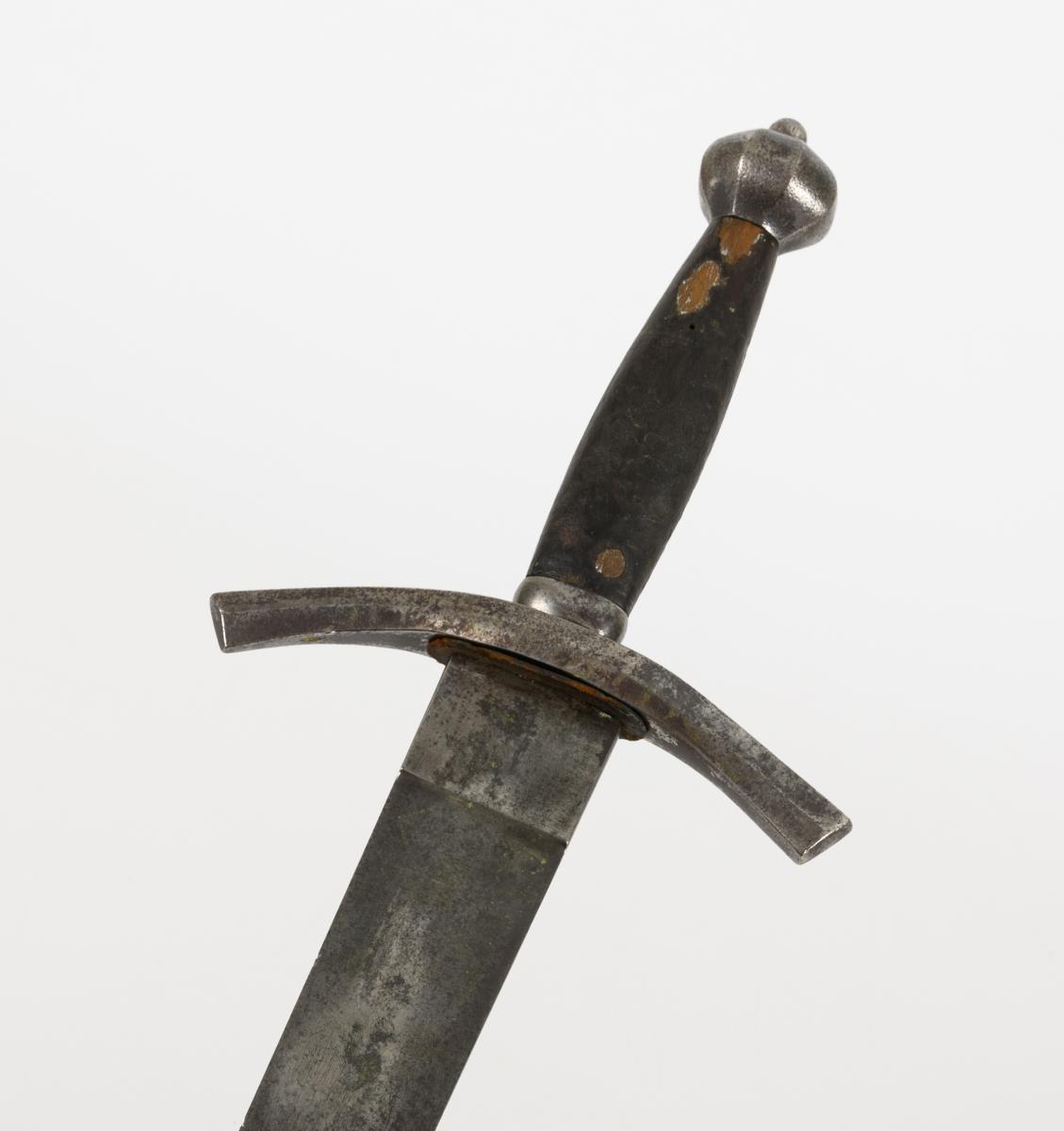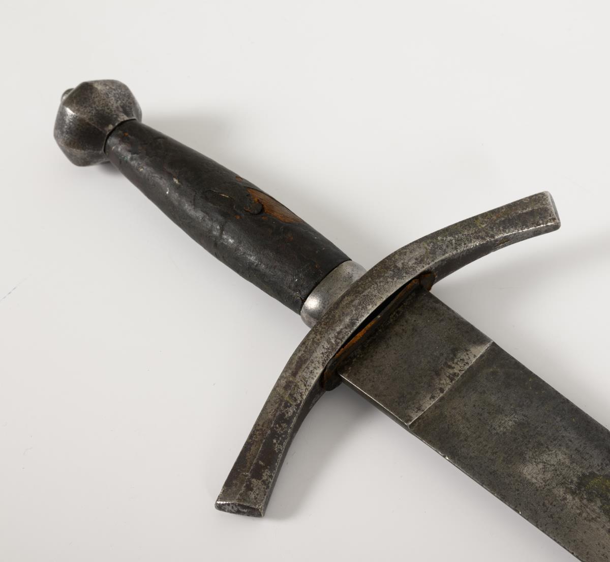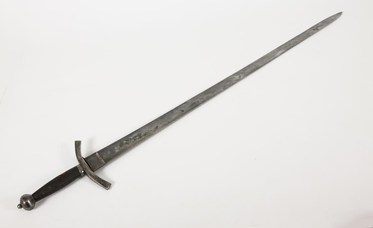 Broad, double-edged blade, curved quillons. Wooden grip with leather cover, this with defects, eight-pointed iron ball pommel.