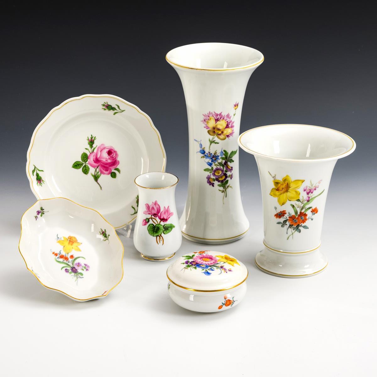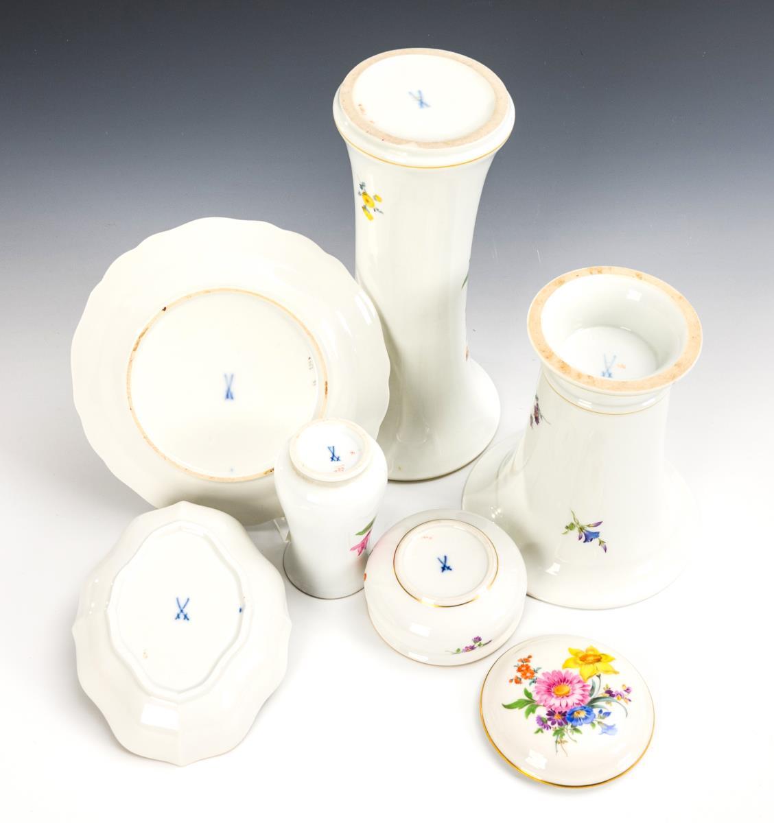 3 vases, box, quatrefoil bowl and plate with flower painting. Meissen.