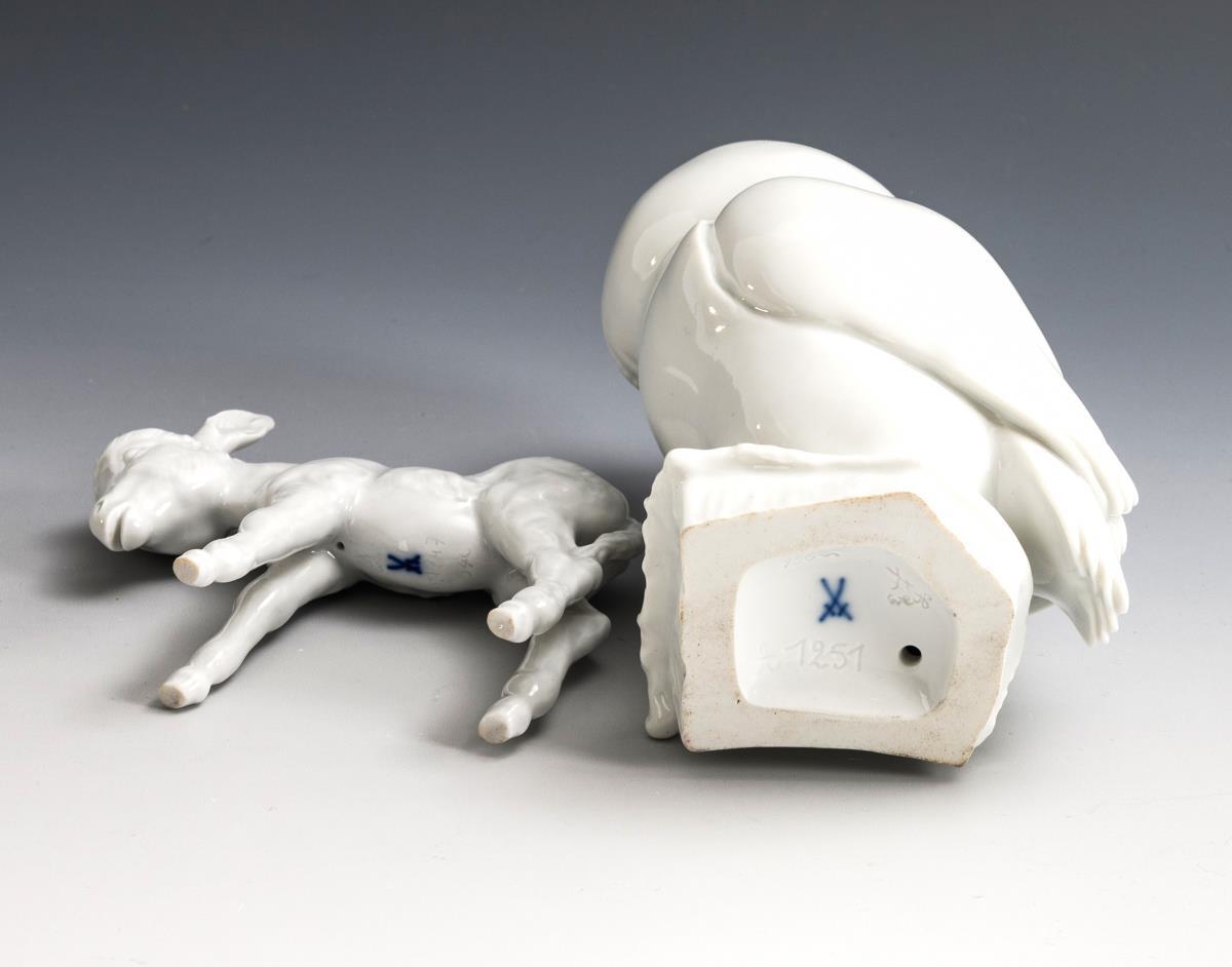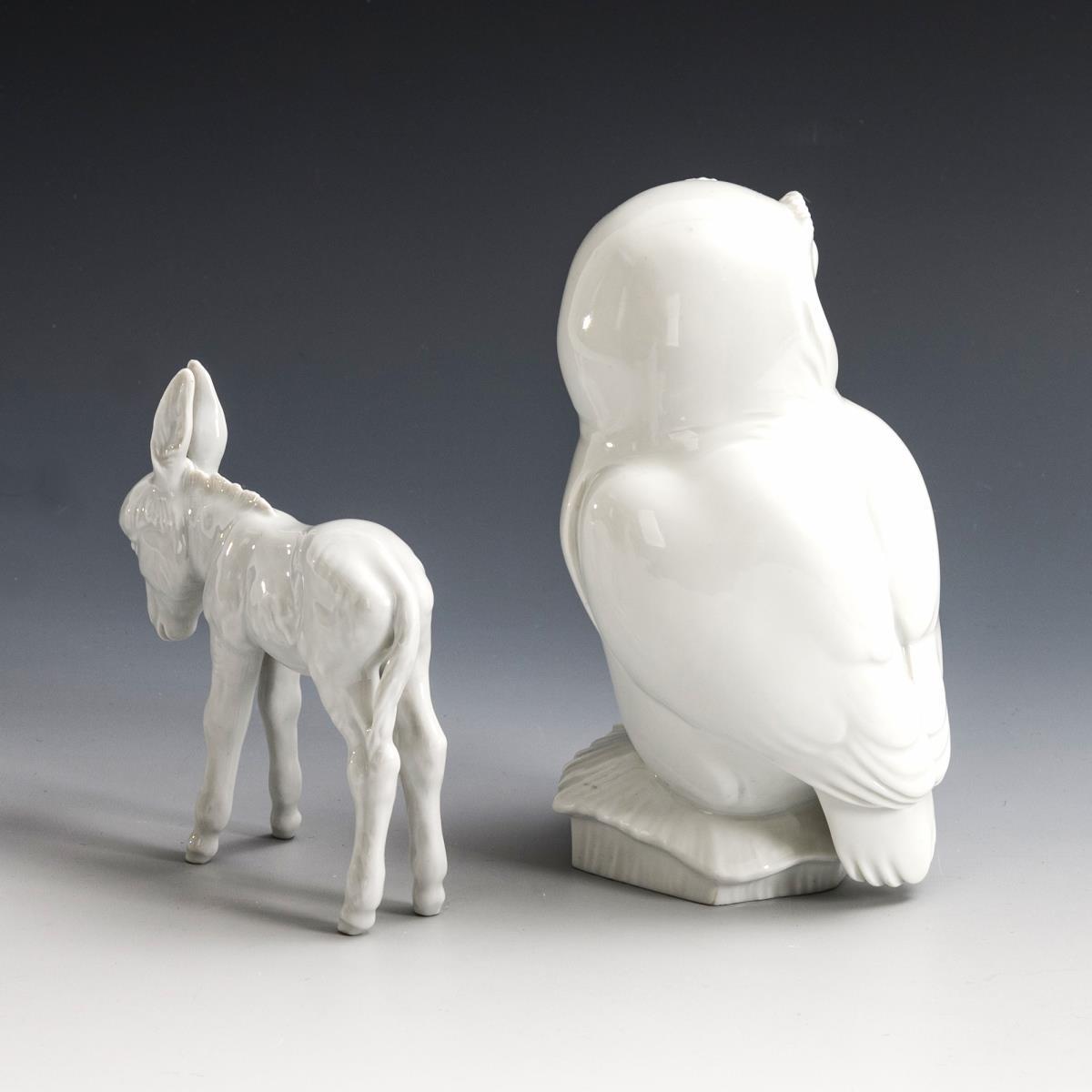 1x Owl, model no. A 1251, design 1933 by Max Esser (1885-1945) (H 15.5 cm). / 1x Donkey foal, model no. A 1247, design 1931 by Willi Münch-Khe (1885-1960) (H 10.5 cm). Right ear tip of the donkey minimally bumped.