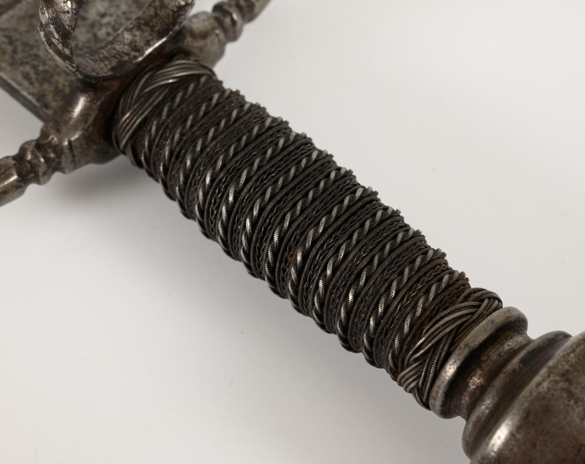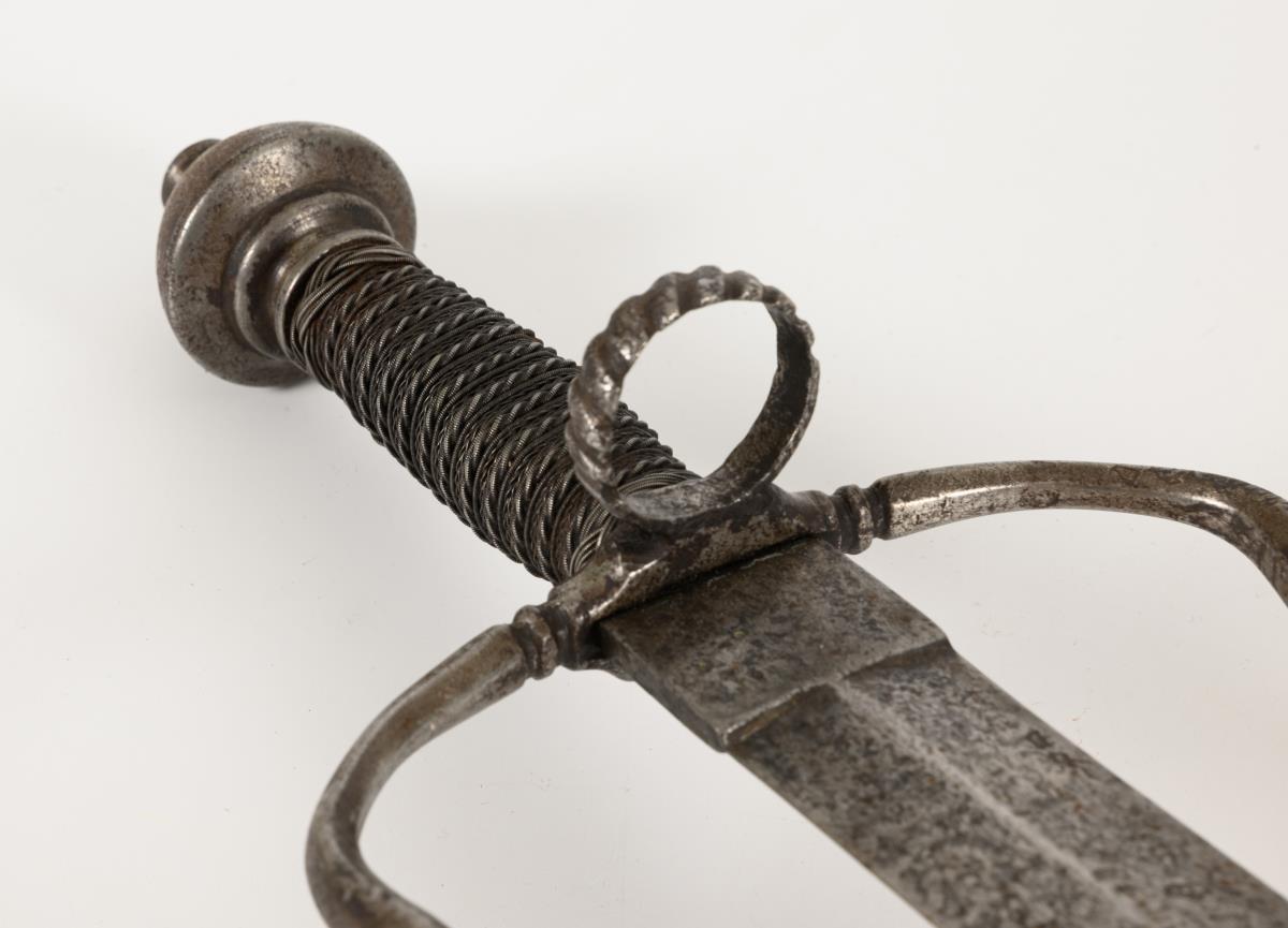 Broad double-edged blade with a central ridge. Crossguard bent towards the blade and 'parrying ring'. Grip with beautiful wire winding and 'thigh collar' (possibly supplemented later) and semicircular iron pommel. Blade and pommel with preserved corrosion scars.