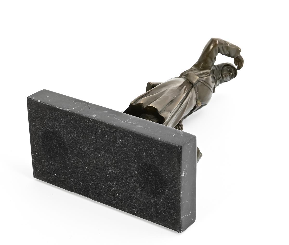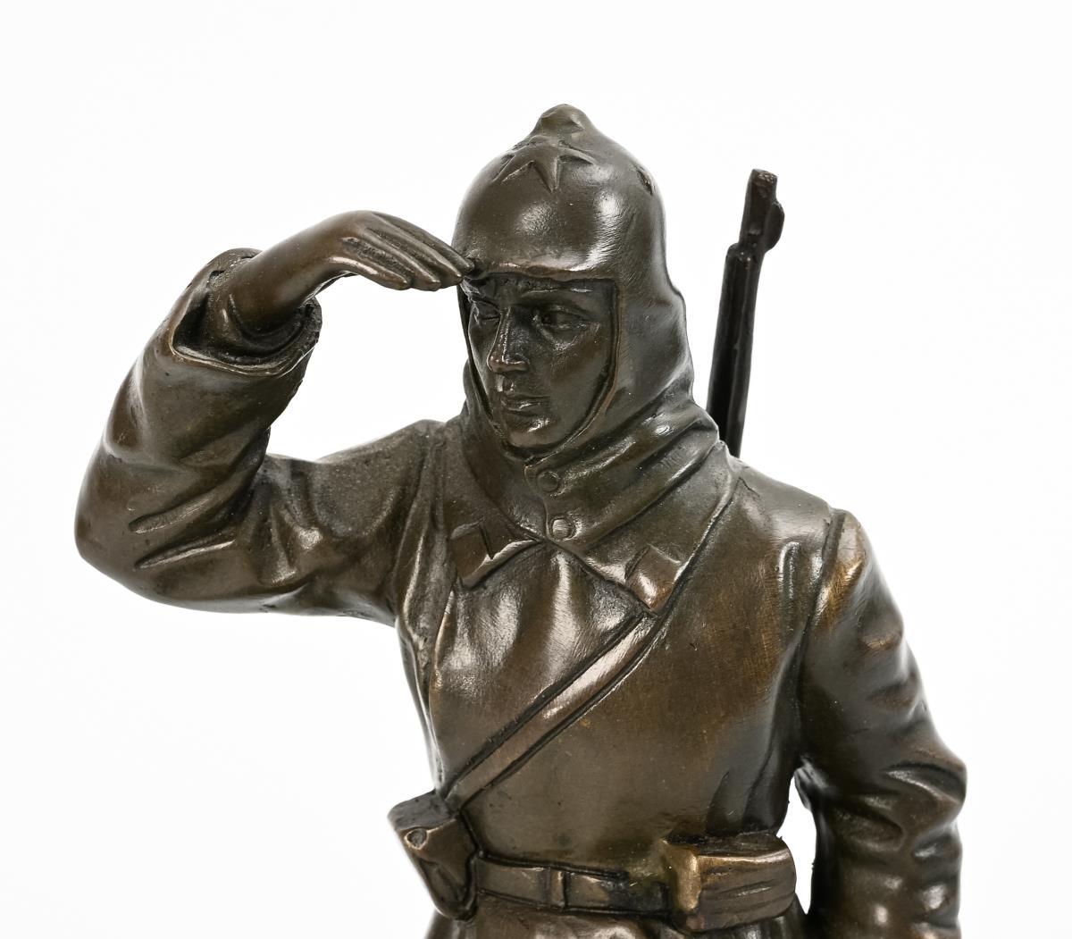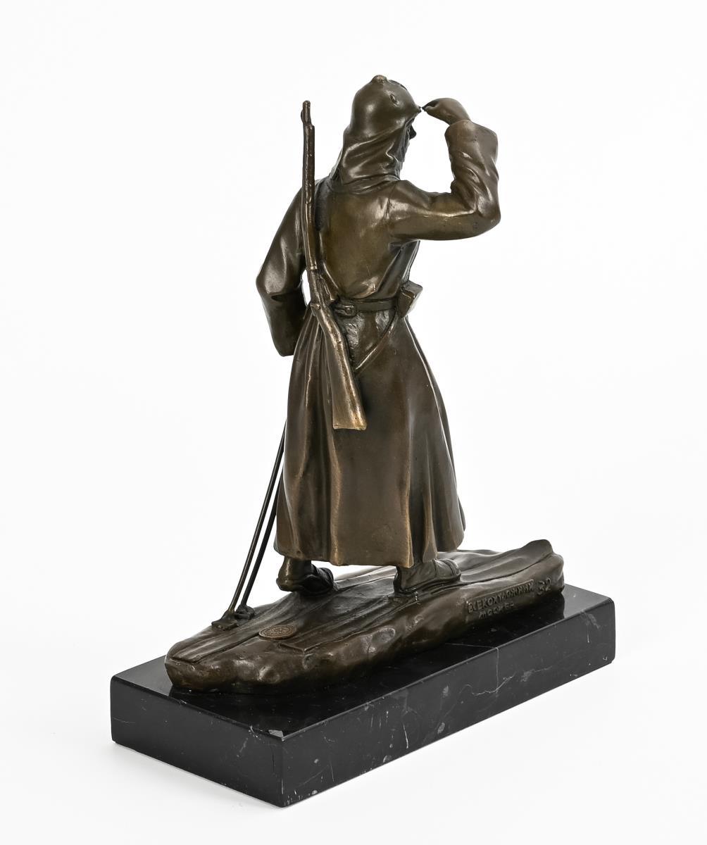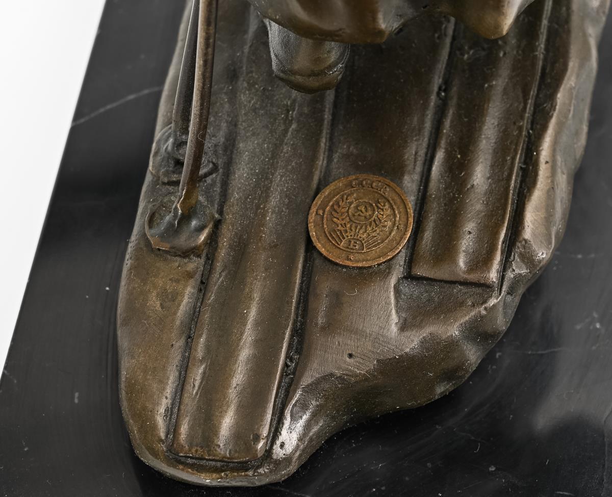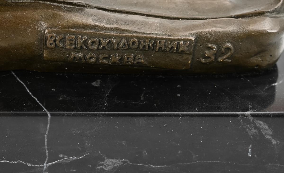 Bronze patinated, black marble plinth. Inscribed in Cyrillic ("vse chudoschnik") with date "32", foundry mark "B C.C.C.P.". H 23 cm, overall 25 x 20 x 10 cm.