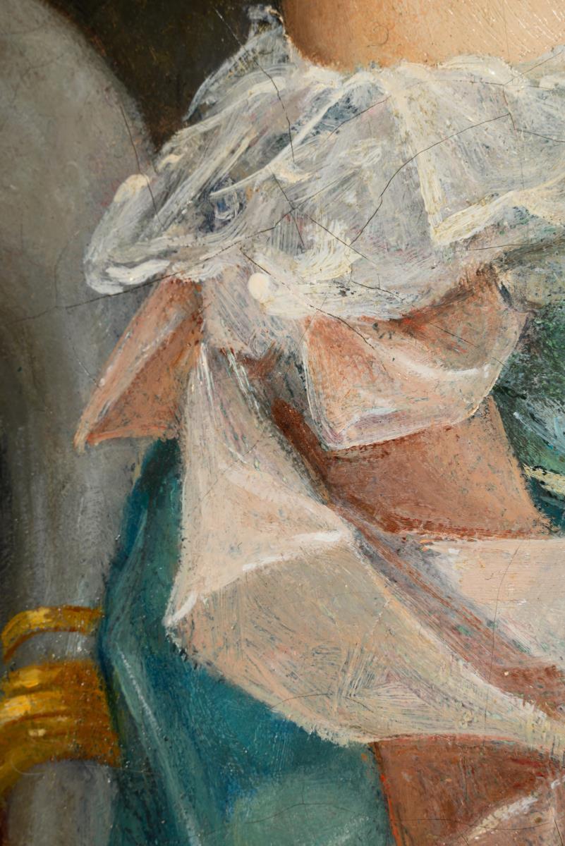 61 x 50.5 cm. Framed : 80 x 65 cm (gold stucco frame with crowning bow).