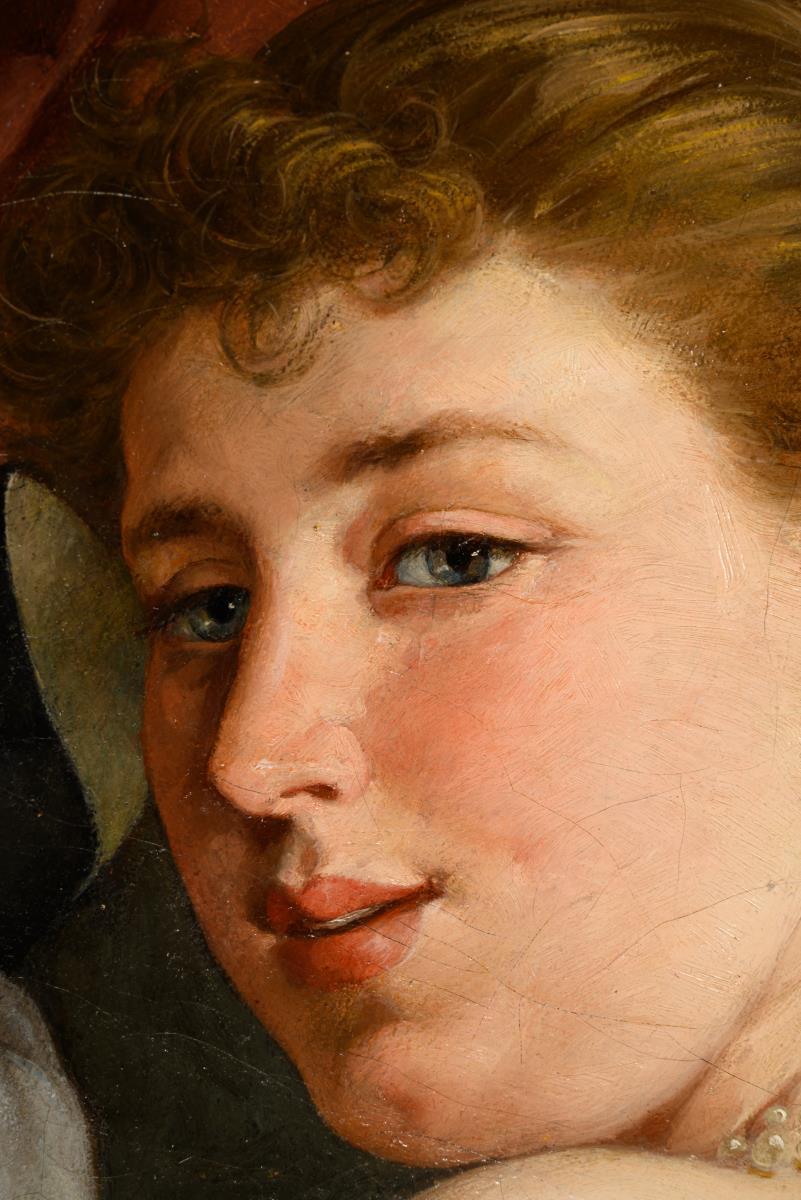 61 x 50.5 cm. Framed : 80 x 65 cm (gold stucco frame with crowning bow).
