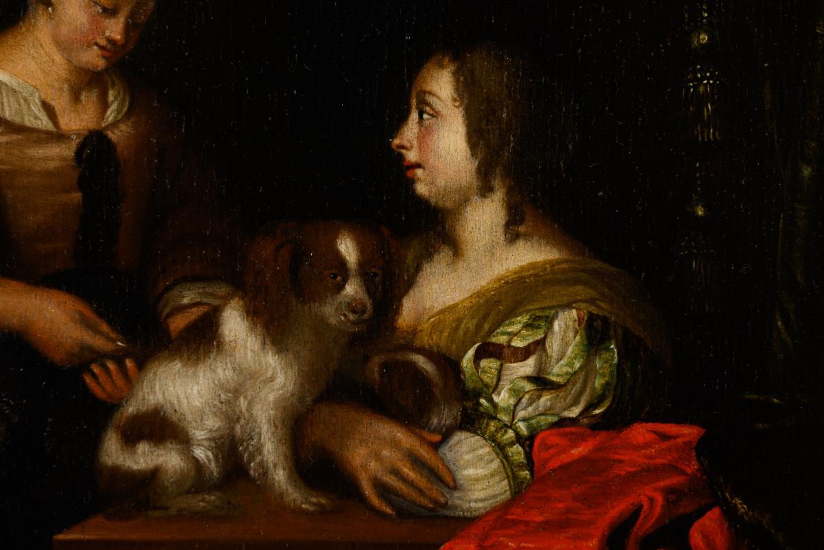High-quality depiction of a young woman in a silk dress with a maid and a dog at a table. Slight traces of age.