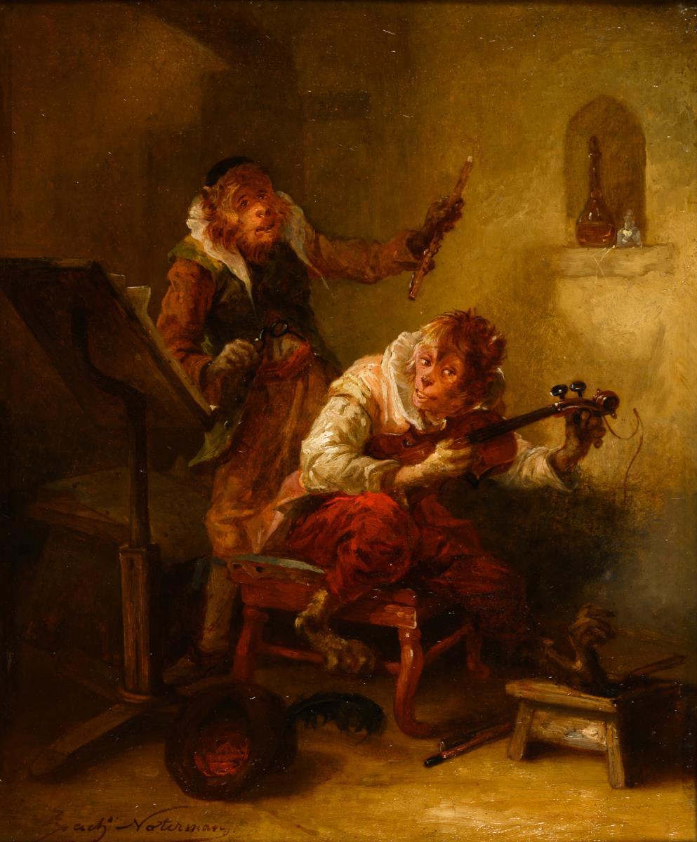 Two monkeys in 19th century dress with violin and flute at rehearsal. Traces of age.