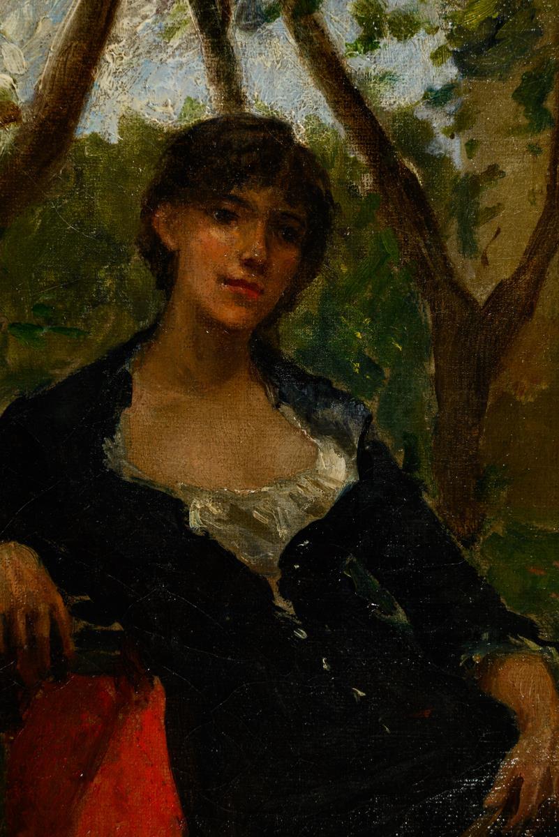 A young woman in a dark dress with fan sitting on a chair in the garden. A restored area with backing.