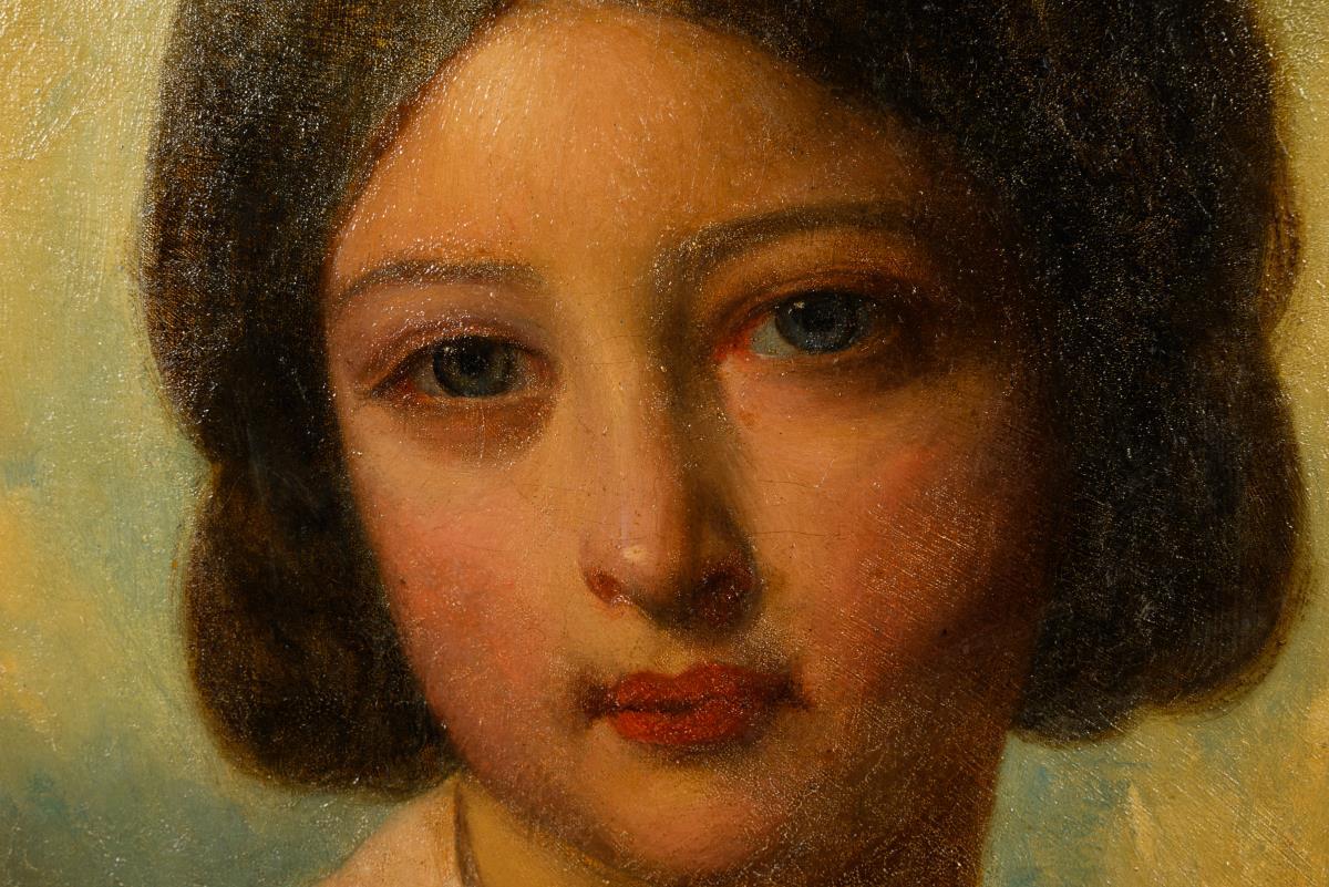 58 x 47.5 cm (oval stretcher). Framed : 70 x 60 cm (gilt stucco frame).
