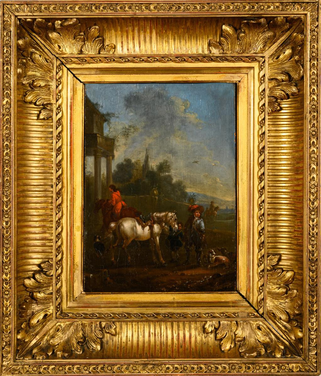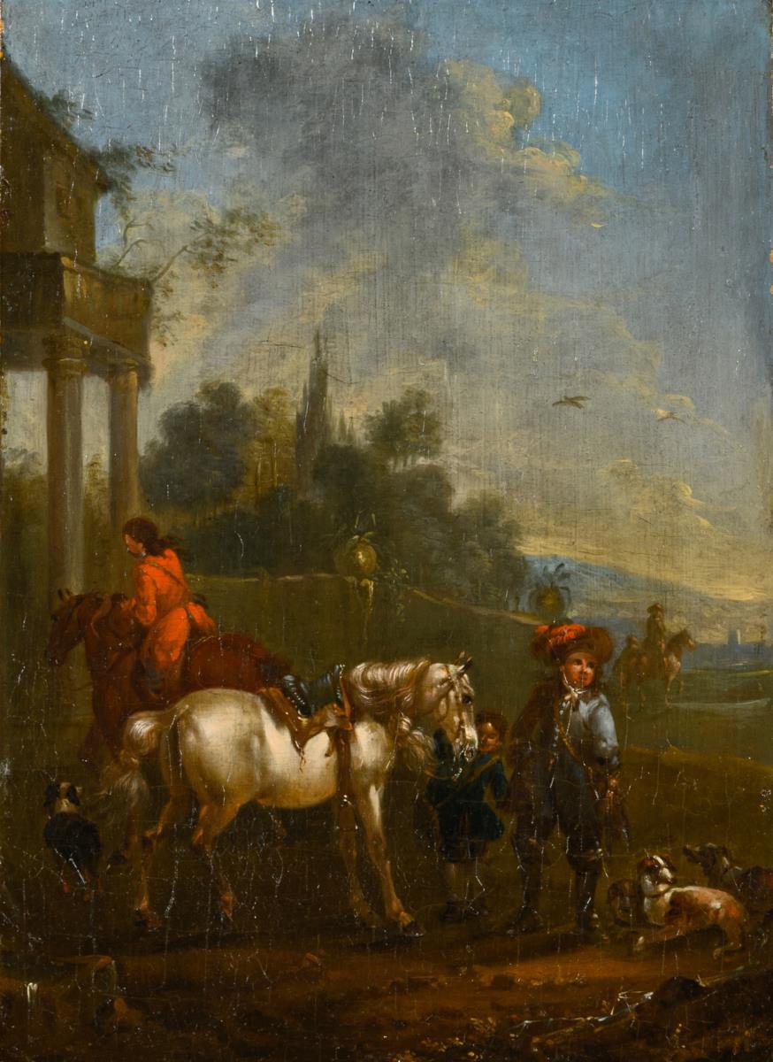 Rider in a sunny landscape with the servants and dogs.