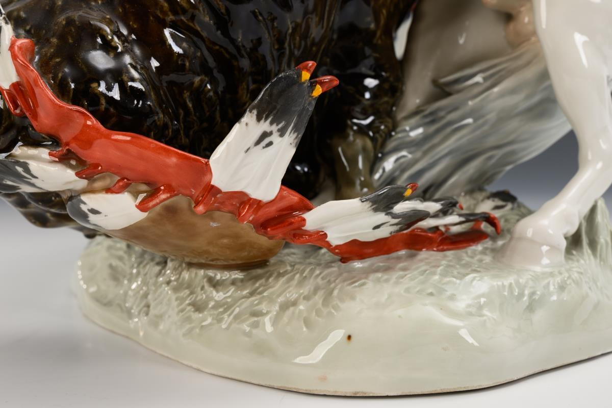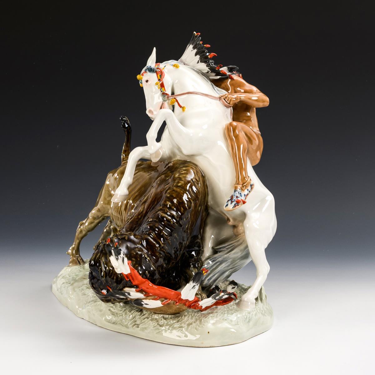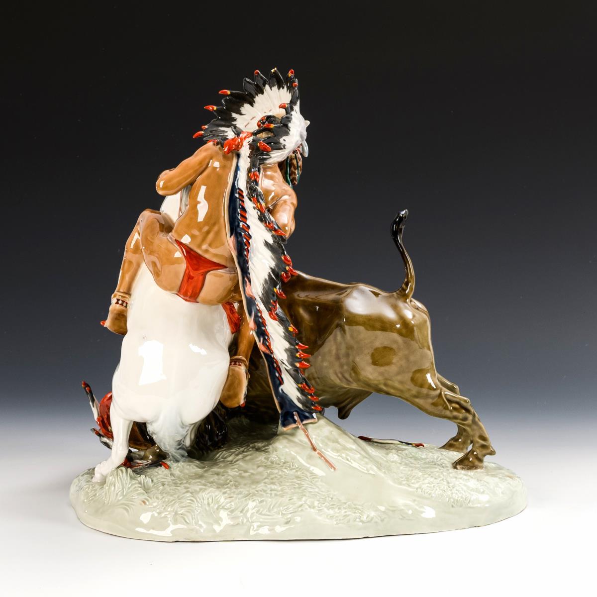 Indian riding a white horse and hunting a bison. Fire crack to the underside of the base (restored to the front), 1 feather tip chipped, feather tips partially restored, feather on the base restored.